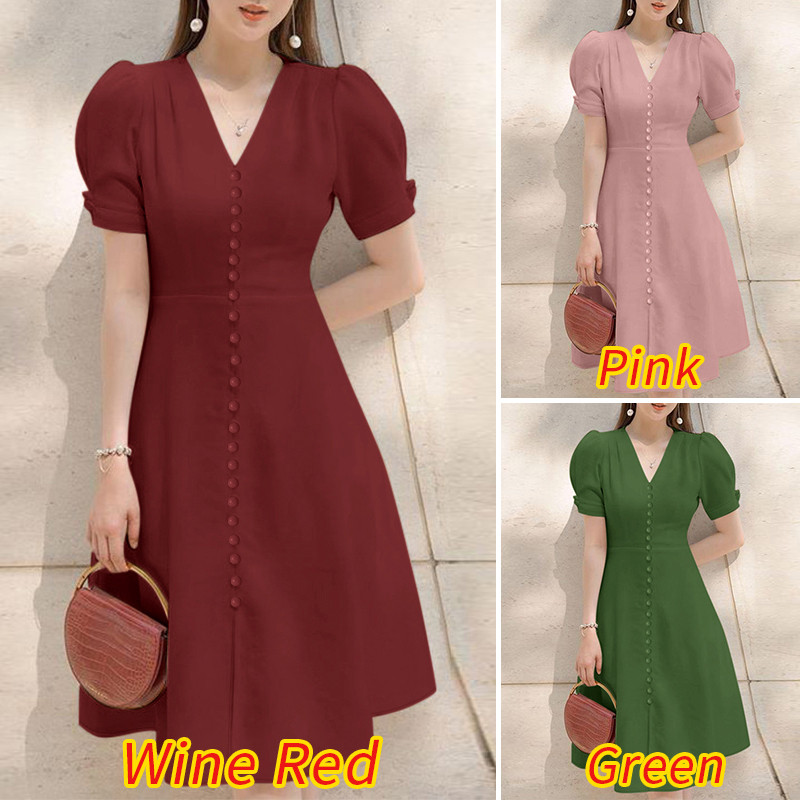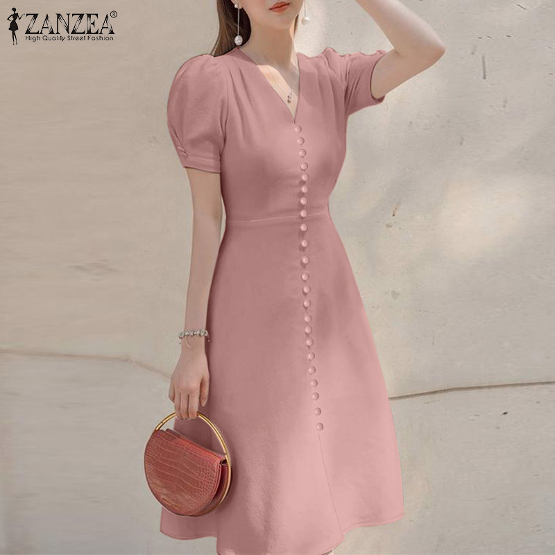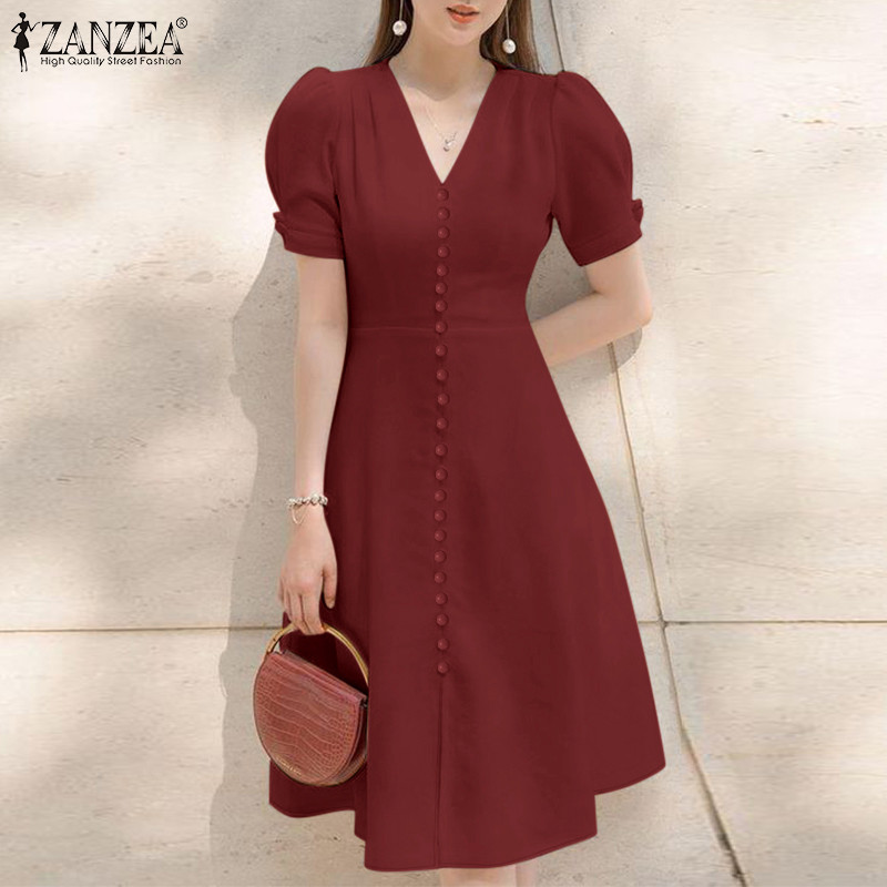 Zanzea ชุดเดรสคอวีแขนสั้นพัฟแฟชั่นสตรีเกาหลี