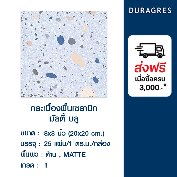 กระเบื้องปูพื้น 8x8 นิ้ว มัลตี้บลู สีฟ้า ผิวด้าน ลายหินขัด Duragres by UMIPRO