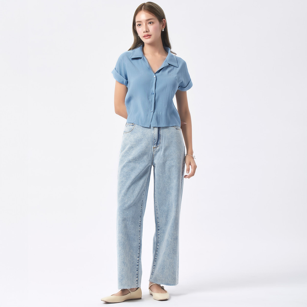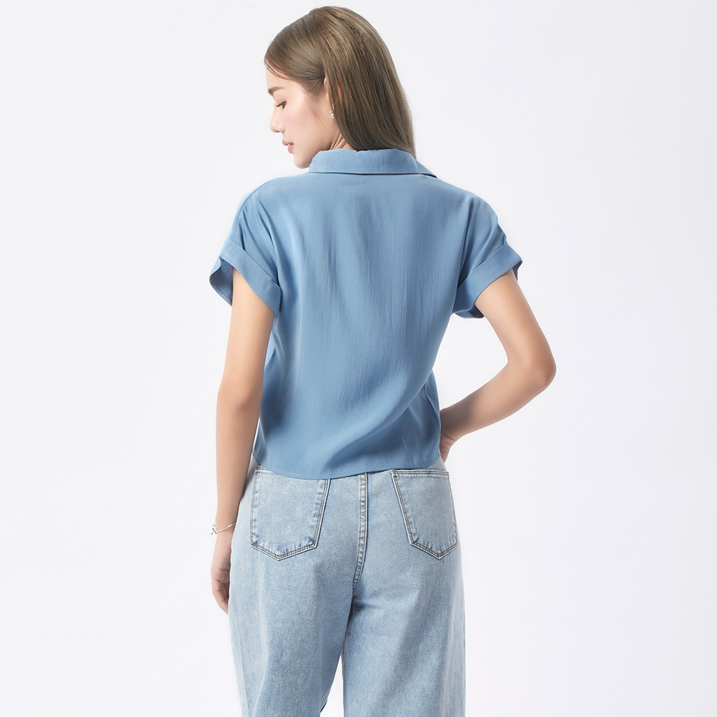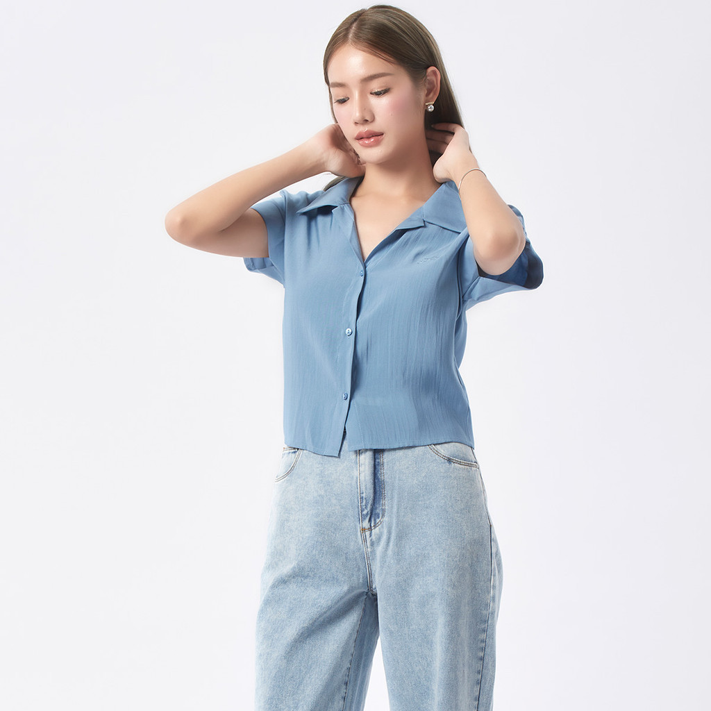 EP เสื้อเชิ้ตแขนล้ำปักโลโก้ ผู้หญิง สีฟ้าเข้ม | EP Logo Embroidery Shirt | 04968