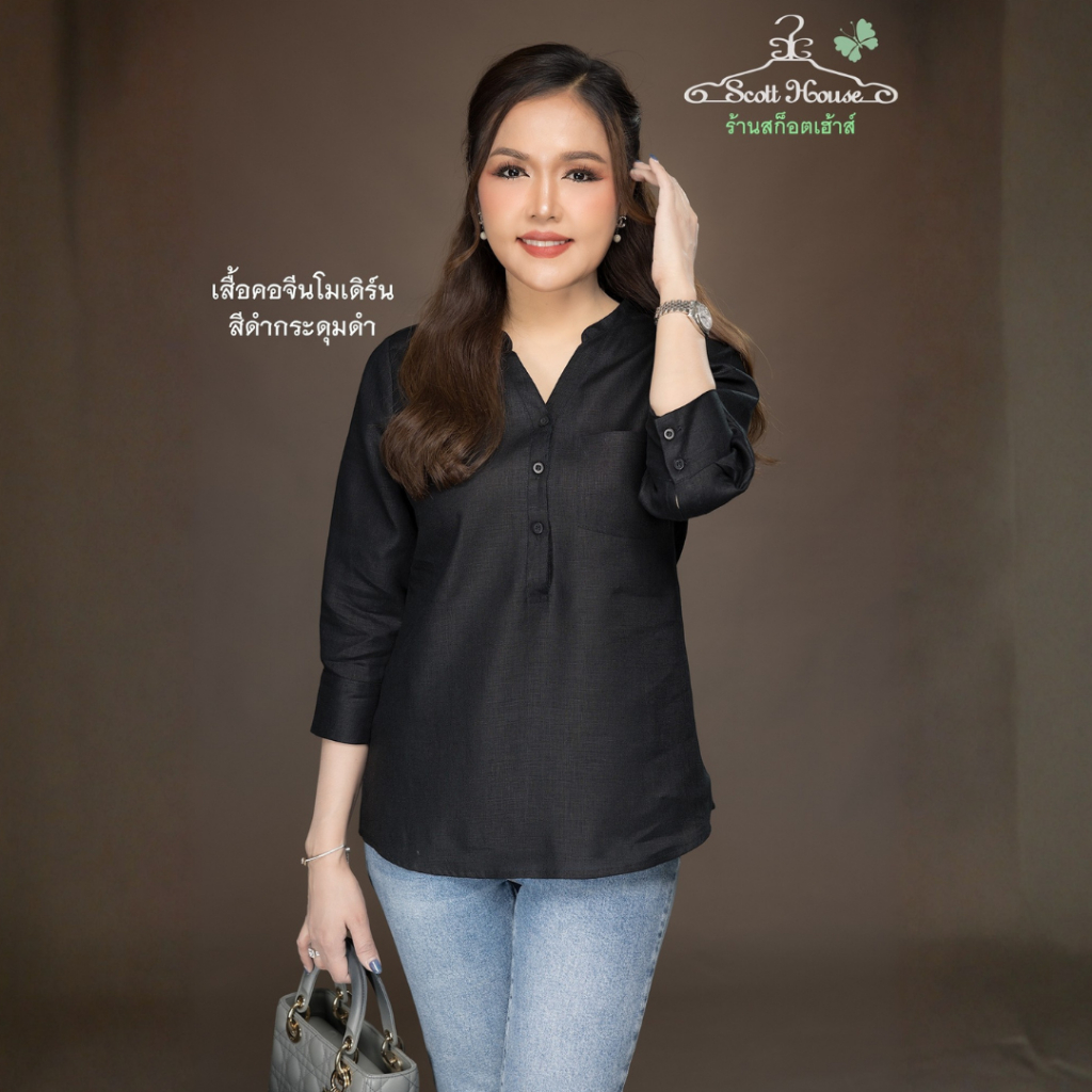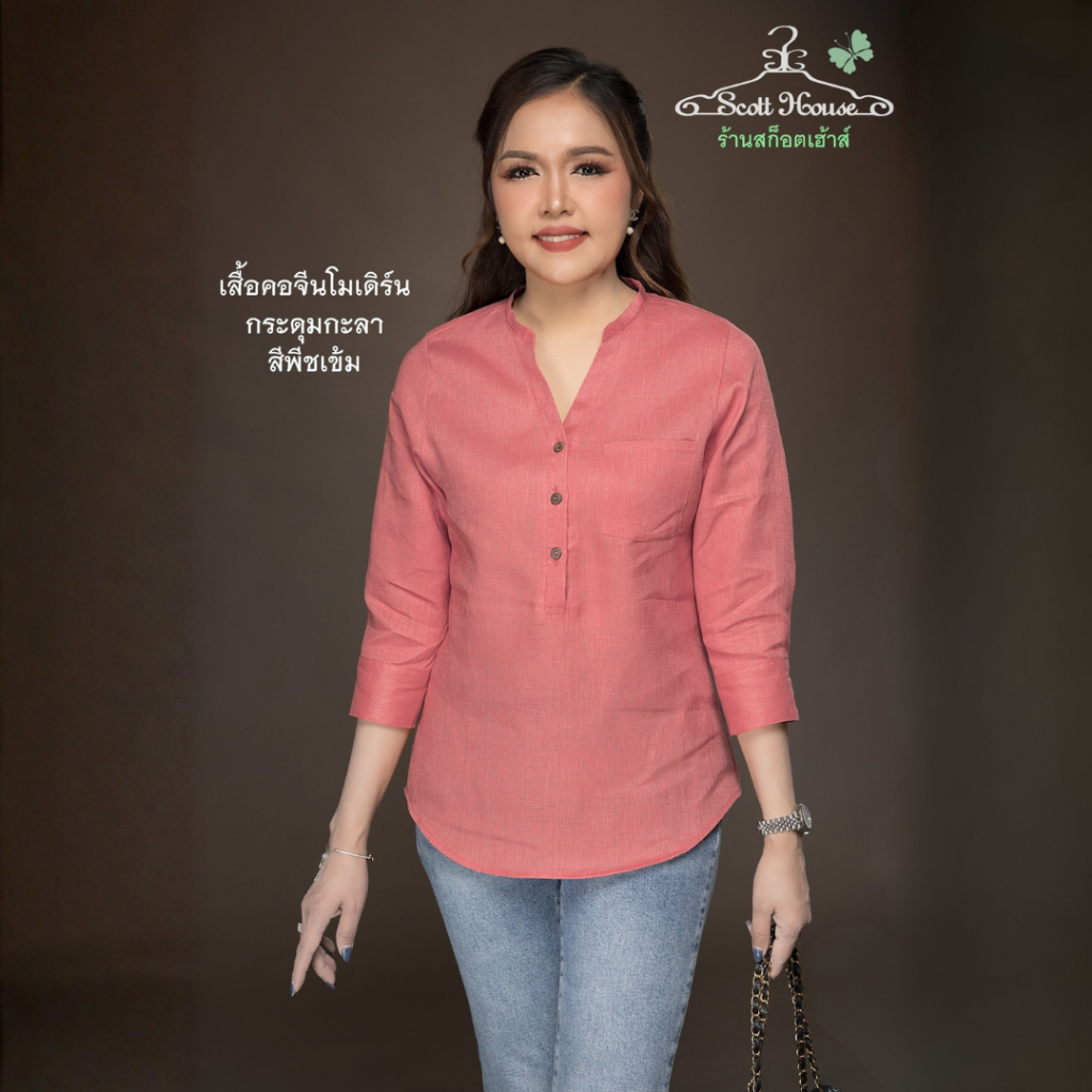 เสื้อลินินแท้100% รุ่นคอจีนโมเดิร์น กระดุมกะลา สีพื้น