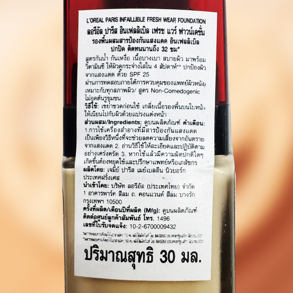 L'Oreal Infaillible 32H Fresh Wear Foundation รองพื้นฝาแดง กันน้ำ กันแดด 30 ML.