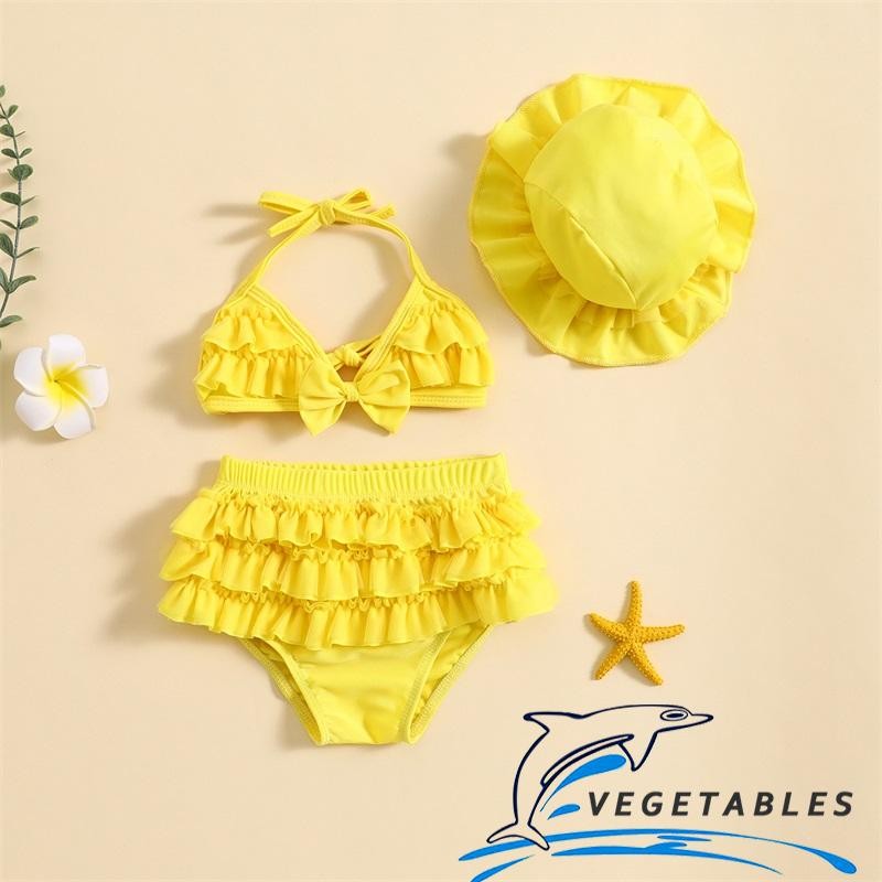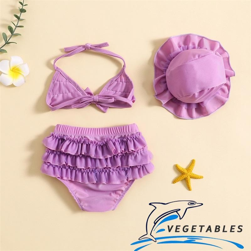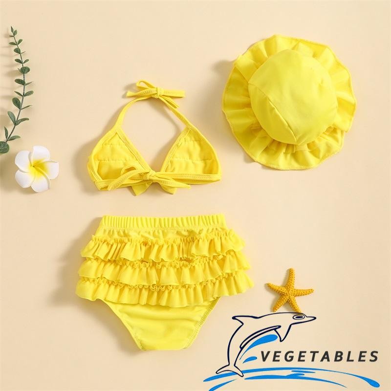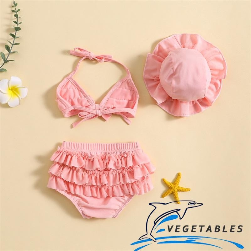 Zhy-ชุดว่ายน้ําฤดูร้อนสําหรับเด็กทารกชุดเสื้อแขวนคอ + กางเกงขาสั้นนัวเนียชั้น + หมวก