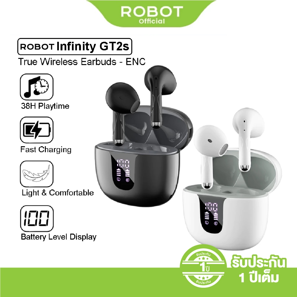 [Robot] รุ่น GT2S หูฟังบลูทูธ หูฟังบลูทูธไร้สายจอ LED เสียงเบสแน่น ลดเสียงรบกวน บลูทูธ 5.4 หูฟังกึ่งอินเอีย แบตอึด