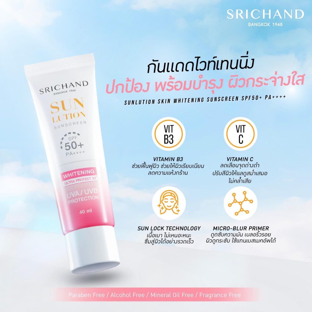 [1FREE1] SRICHAND กันแดดสกินแคร์ สูตรผิวขาวกระจ่างใส ซันลูชั่น สกิน ไวท์เทนนิ่ง ซันสกรีน เอสพีเอฟ 50+ พีเอ++++ 40 มล.