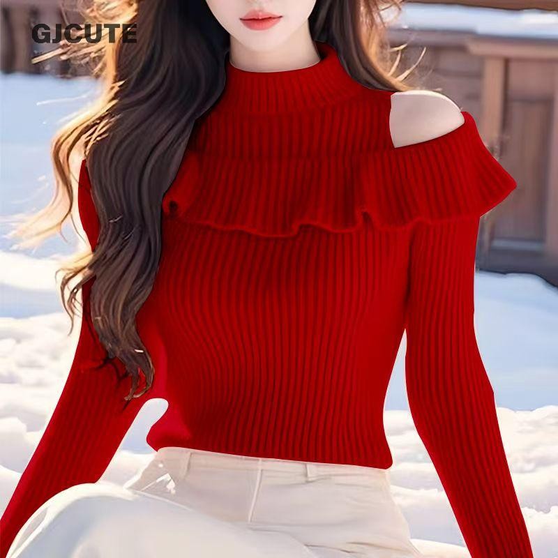 Gjcute เกาหลีครึ่งคอเต่า Ruffle Off-ไหล่แขนยาว Slim ถักเสื้อกันหนาวสําหรับผู้หญิง WTD