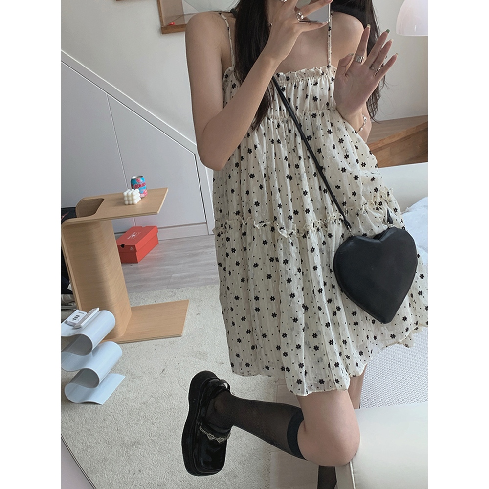 เดรสฝรั่งเศส เดรสลายดอกไม้ สายเดี่ยว สั้น หลวม สไตล์หวาน