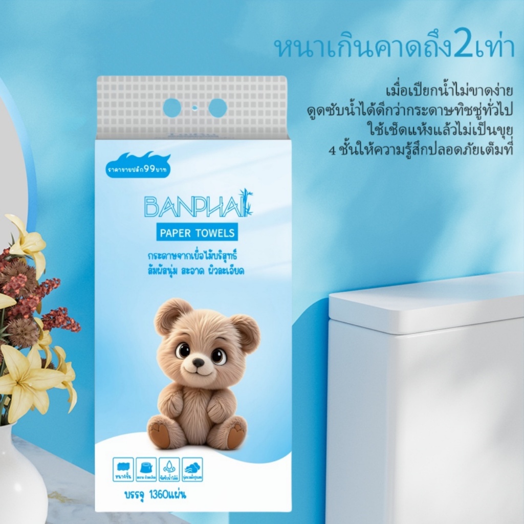 6แพ็ค4ชั้น กระดาษทิชชูนุ่มหนา BANPHAI GB/T 20808 1360ชิ้นต่อแพ็ค ไทย ขนาด 175 * 155มม กระดาษชําระ