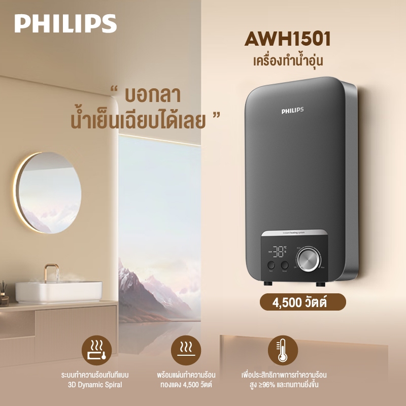 Philipswater เครื่องทำน้ำอุ่น 4500 วัตต์ รุ่น AWH1501 / AWH1504 / AWH1505 ประหยัดไฟ สีเทา