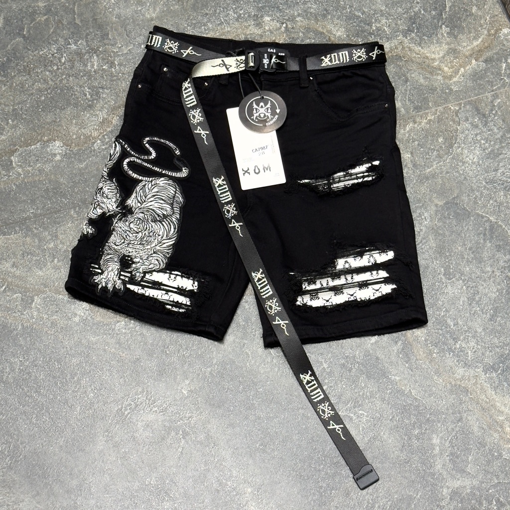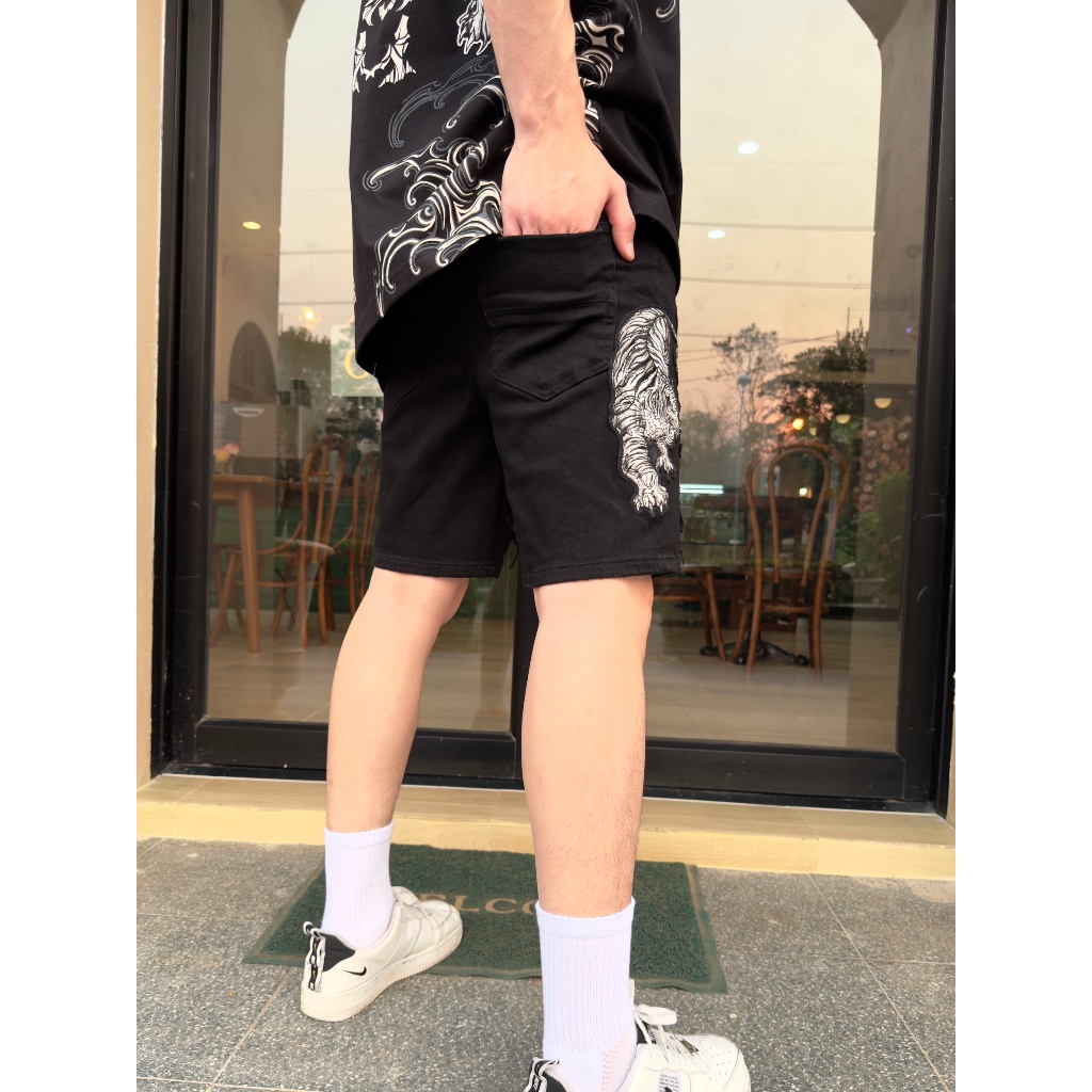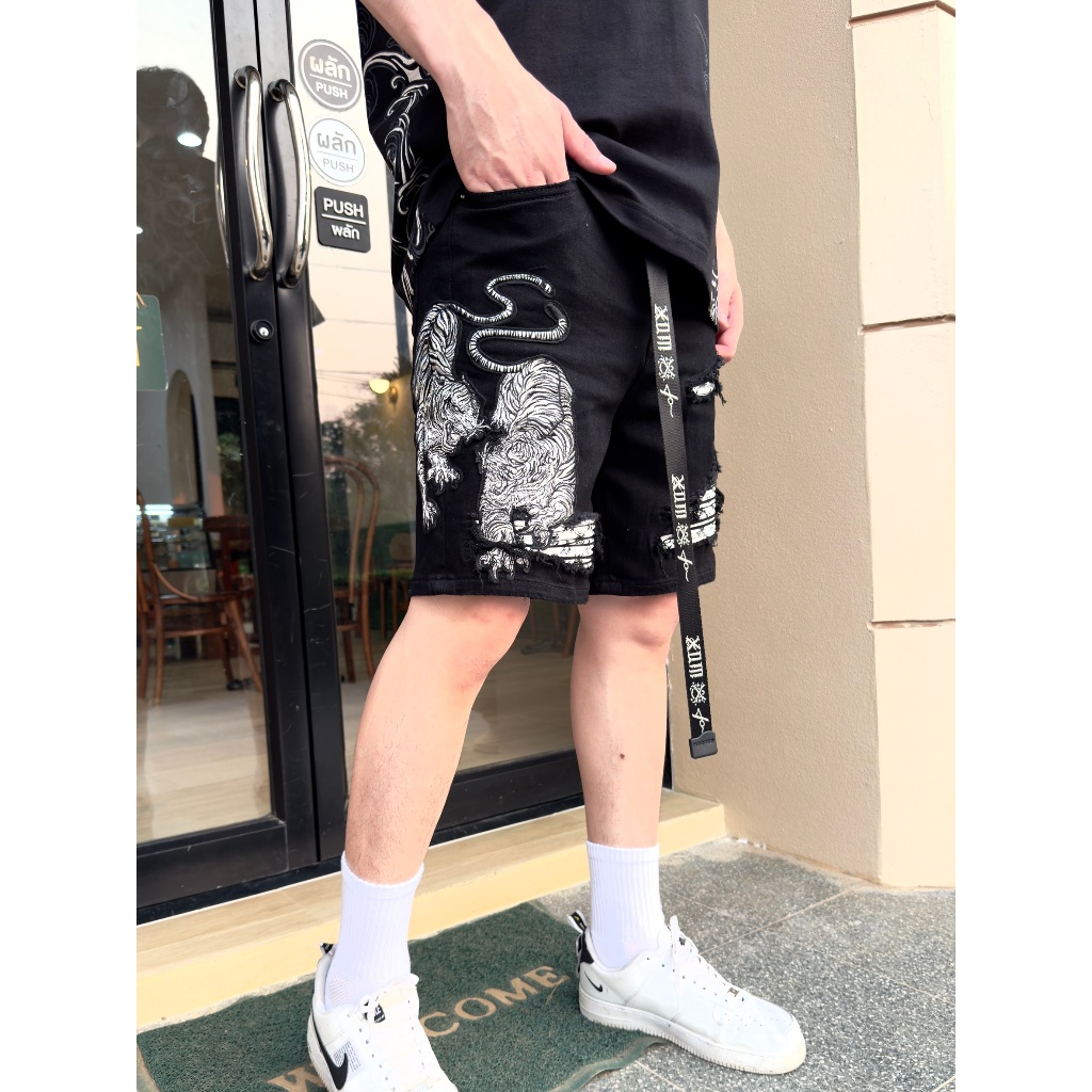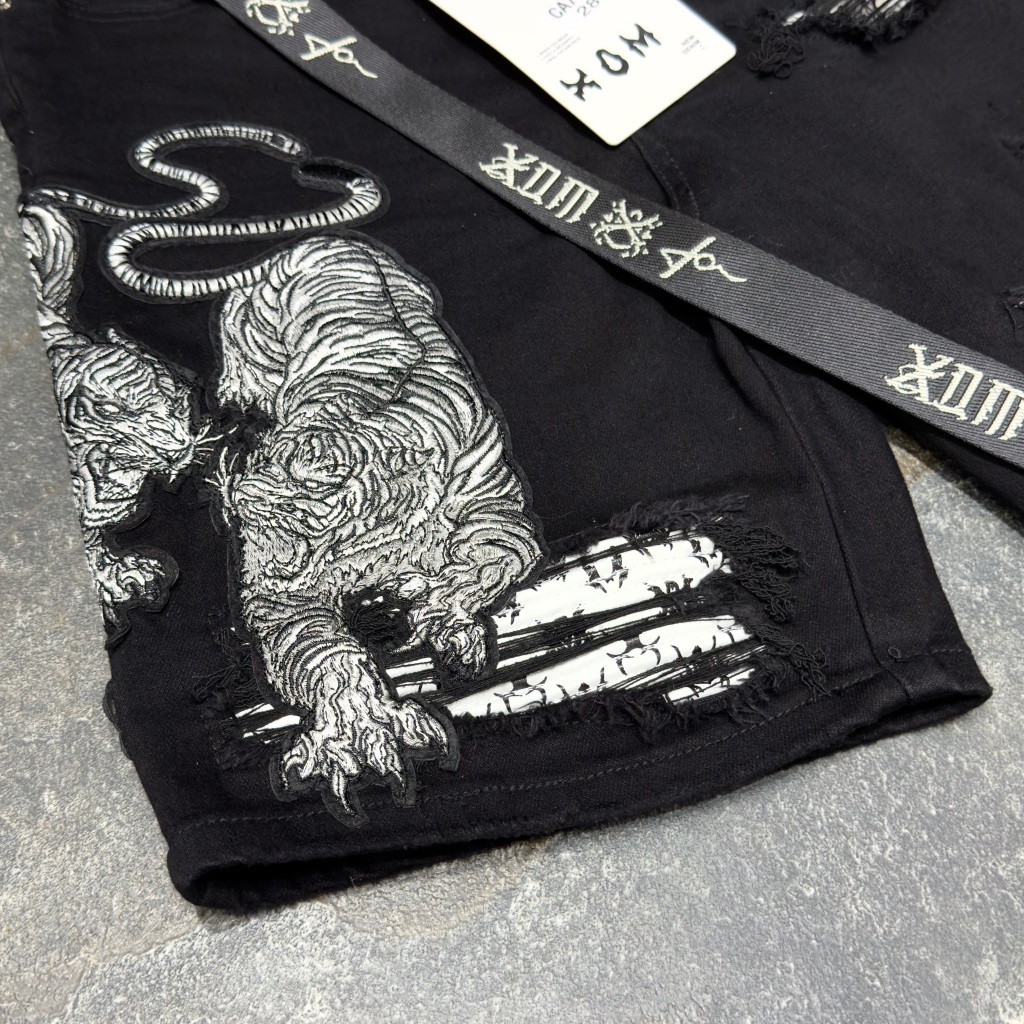 XOM708 กางเกงยีนส์ขาสั้นสีดำ ปักเสือคู่ ซับหนังขาวลายxom