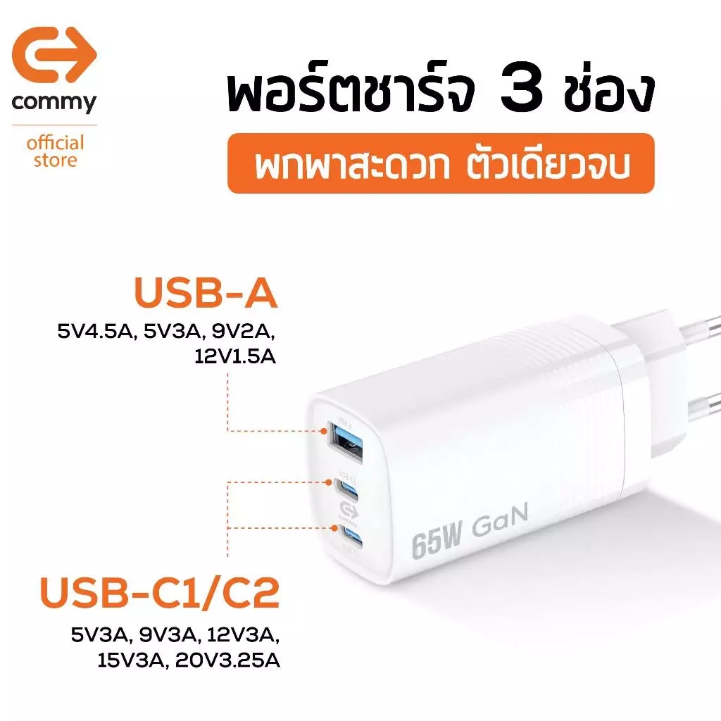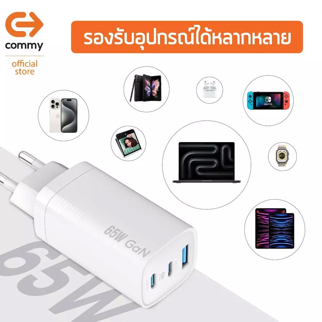 อะแดปเตอร์ 65W รองรับ iOS และ Android PD+QC3.0 จาก Commy