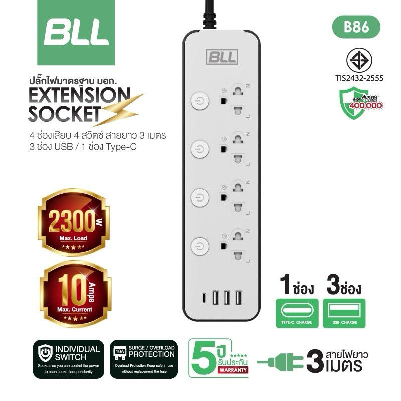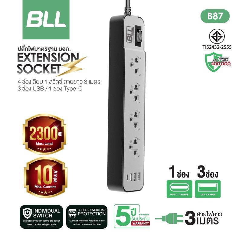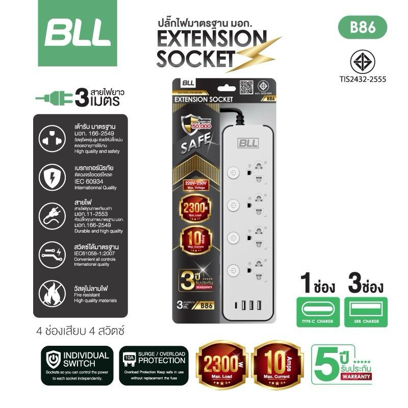 BLL ปลั๊กรุ่นใหม่ มอก.แท้ ปลั๊กไฟ BLL ยาว 3 เมตร 3 ช่องUSB+1Type C รองรับกำลังไฟ2,300 วัตต์