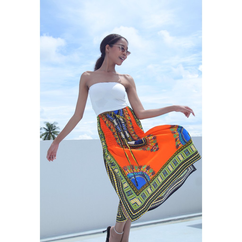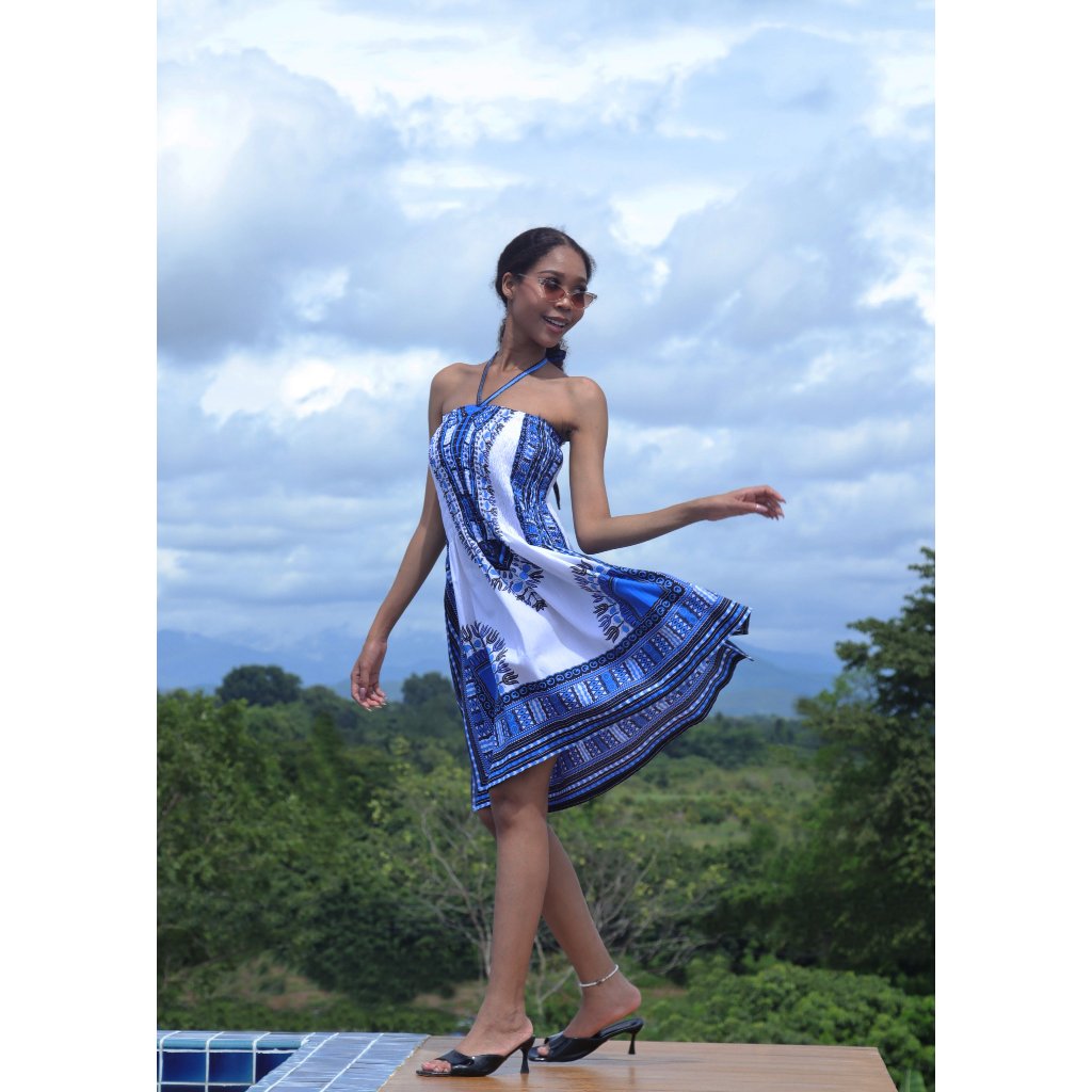 DA'IKI เดรสแอฟริกัน สไตล์โบฮีเมียน ผ้าคอตตอนเอวสม็อคมีเชือกผูกคล้องคอเปิดไหล่สวยงาม ใส่เป็นกระโปรงได้