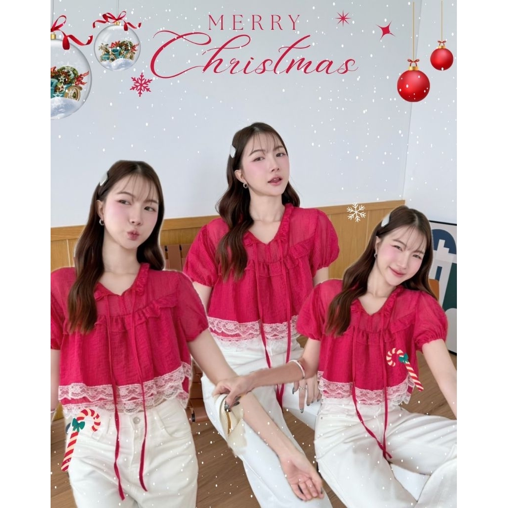 Fluffy : เสื้อครอปแขนตุ๊กตาคอกลมระบายผูกโบว์หน้า ดีเทลแต่งระบายขอบลูกไม้ไล่เรเยอร์2ชั้น