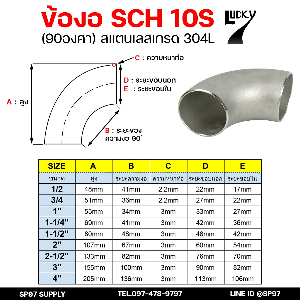 Lucky7 ข้องอ 90องศา ข้องอสแตนเลส 304 SCH10 ข้องอ เบอร์ 10 ข้องอด้านNB ข้องอ อุดสาหกรรม