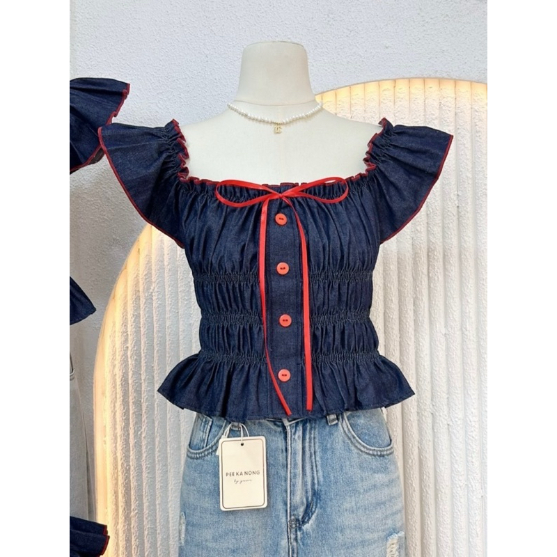 NN617 เสื้อครอปแขนระบายยีนส์ ผูกโบว์อก Peekanong🌷