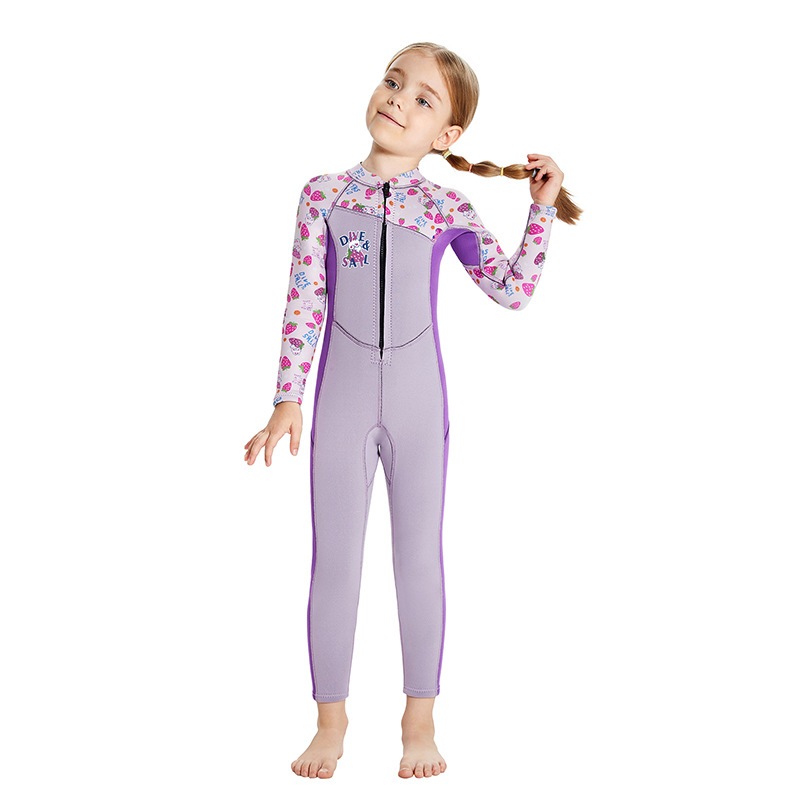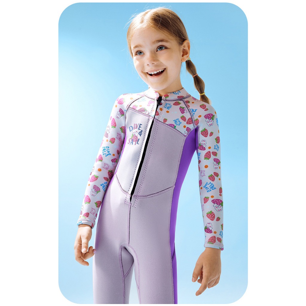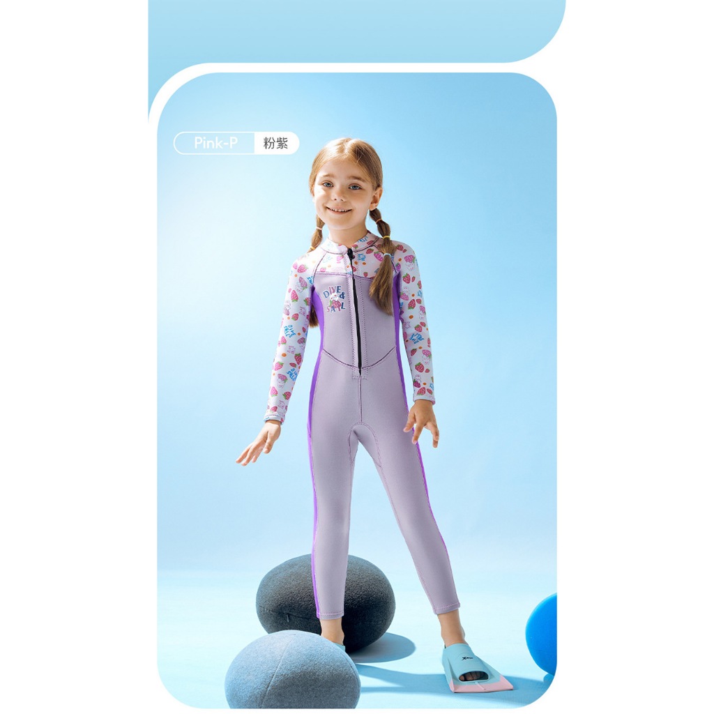 (แถมหมวก) ชุดว่ายน้ำเด็กหญิง เก็บอุณหภูมิ 2.5MM GA-T.ม่วง-สตอเบอรี่ ยาว