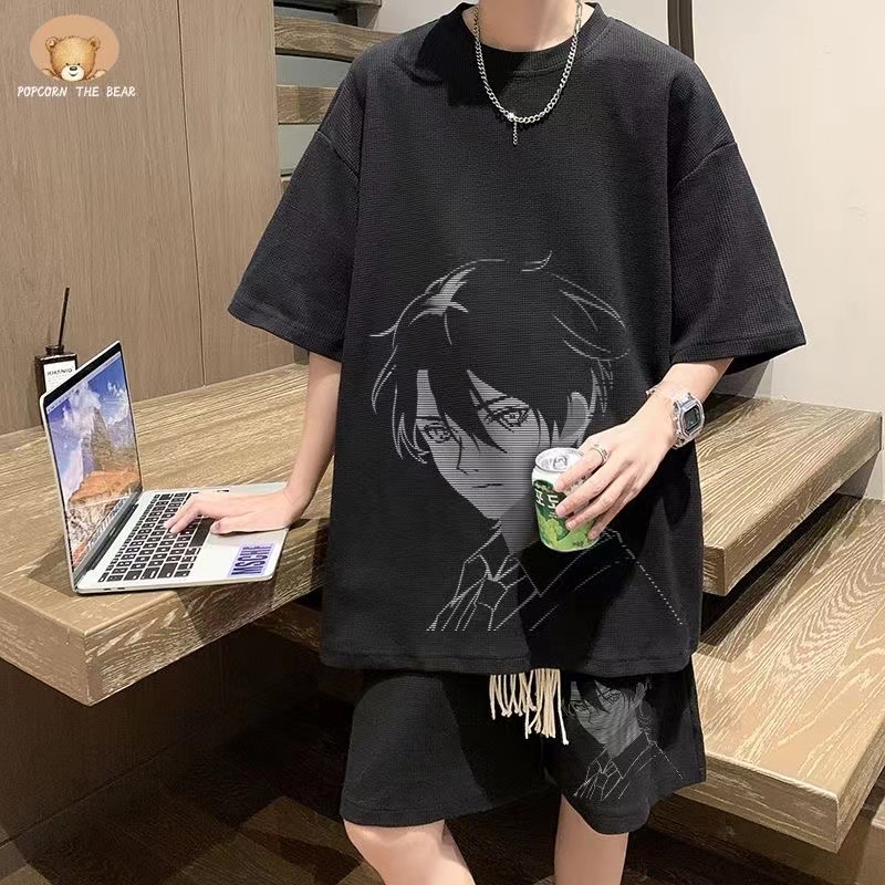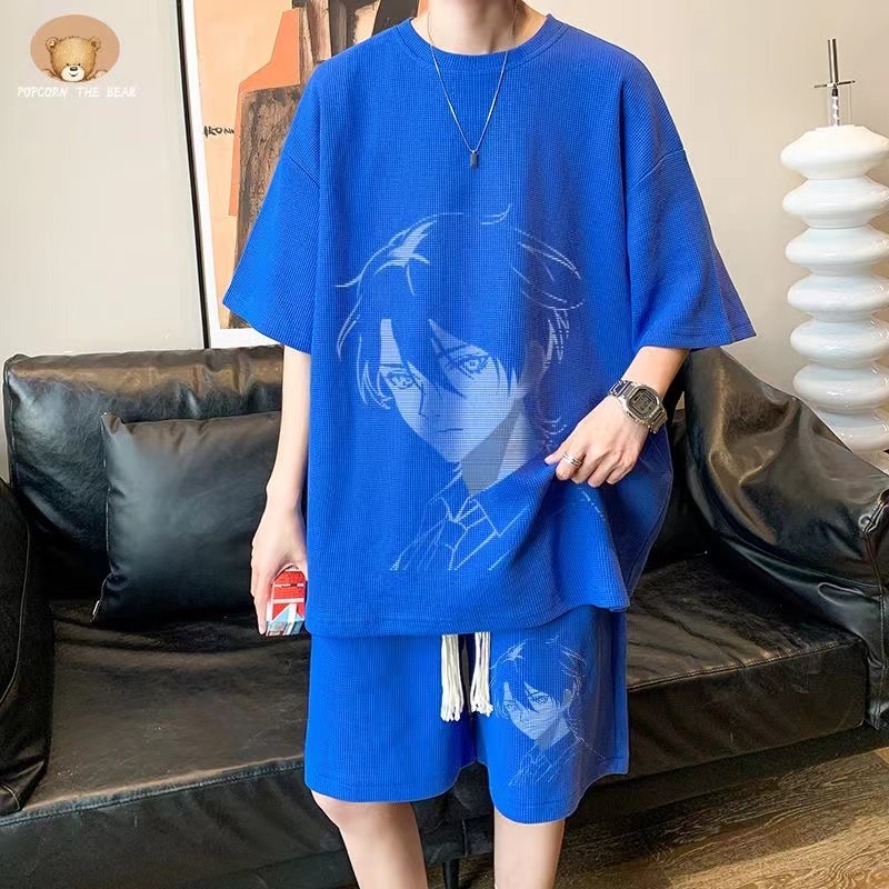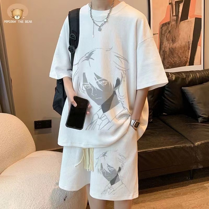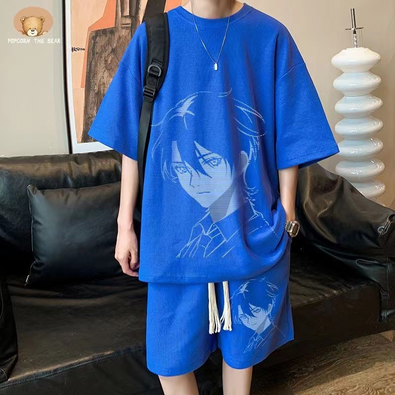 ชุดสูทผู้ชายสไตล์ญี่ปุ่น ผ้าวาฟเฟิล แขนสั้น + กางเกงขาสั้น ชุดทูพีซแฟชั่น