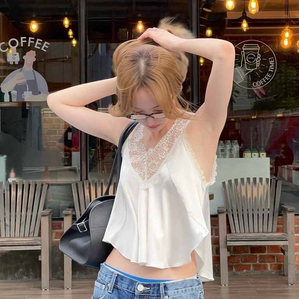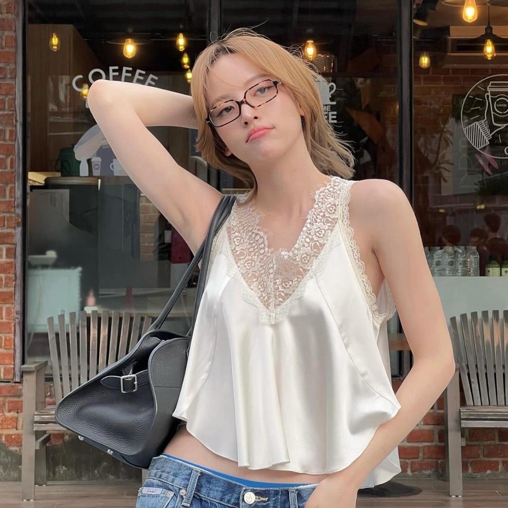 Nita top เสื้อกล้ามลูกไม้ คอวี แต่งชายโค้ง เนื้อผ้าซาติน KN.Clothes