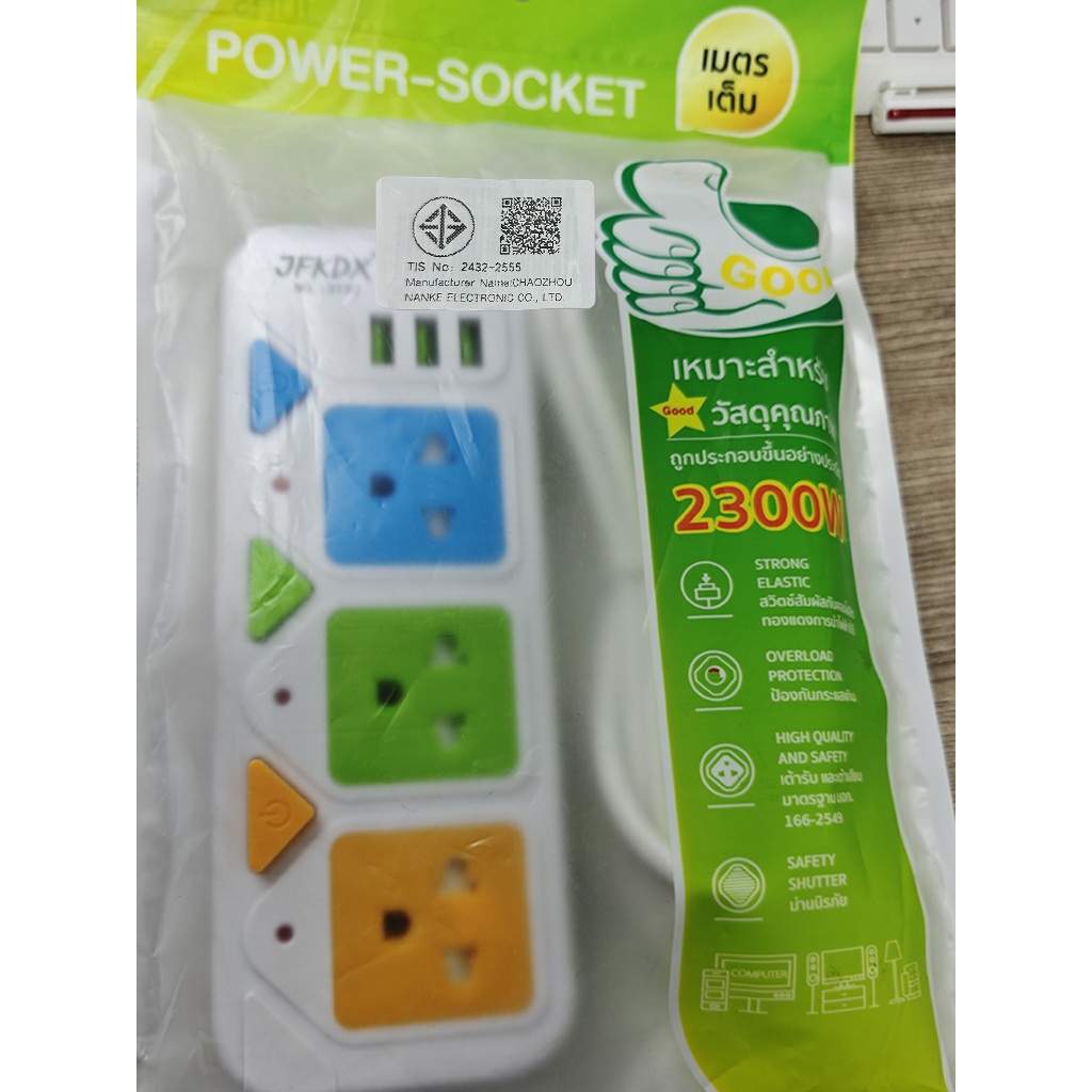 JFKDX ปลั๊กไฟ 3 ปลั๊ก 3 พอร์ต USB 3 เมตรยาว 5 เมตร ปลั๊กขยาย มาตรฐาน TIS คุณภาพดี ปลั๊กไฟที่ทําจากทองเหลือง 10A 2300W
