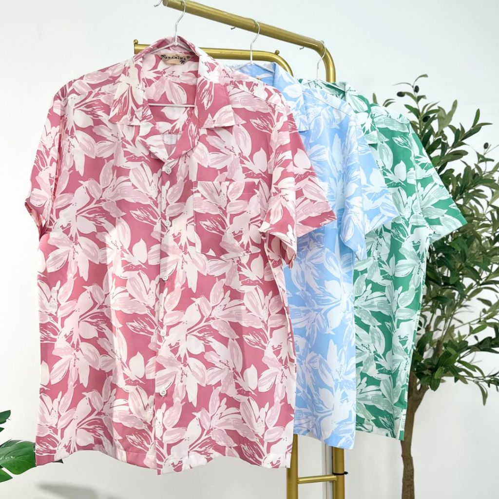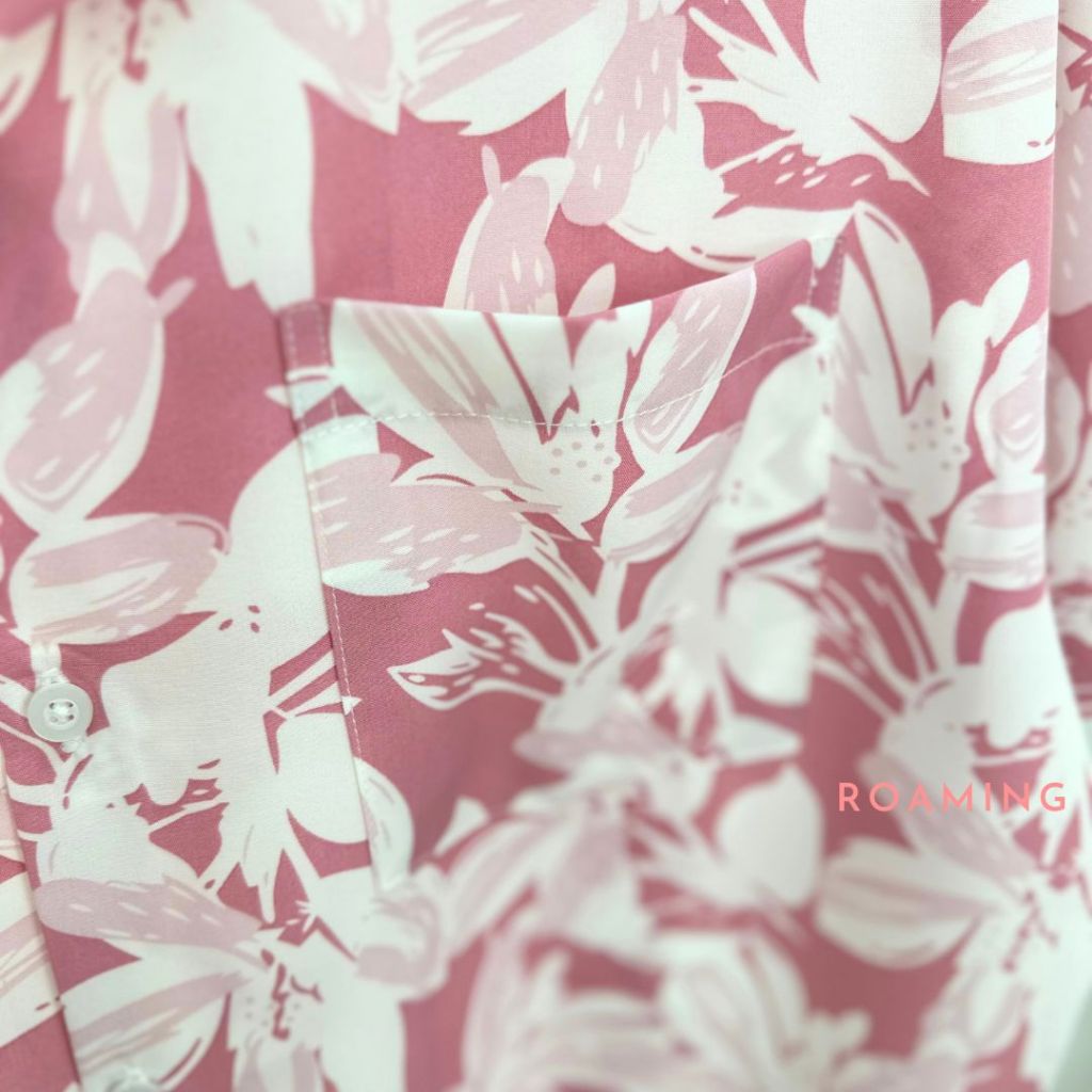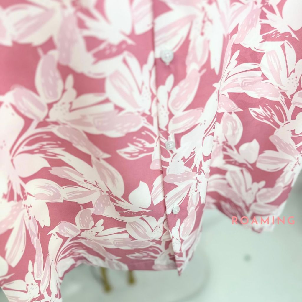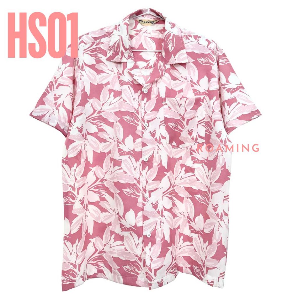 ROAMING HS01 เสื้อฮาวาย เสื้อครอบครัว ผ้าไหมอิตาลี ยับยาก ไม่ต้องรีด Italian Silk Hawaiian Shirts (ลายใบไม้ชมพู)