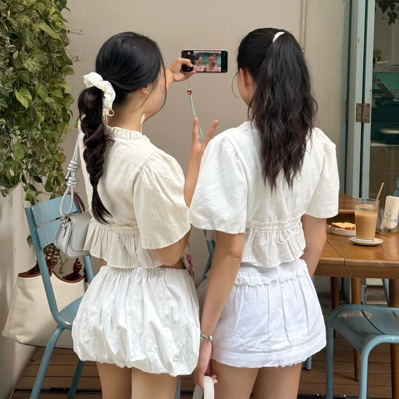 𝐅𝐥𝐮𝐟𝐟𝐲 𝐂𝐫𝐨𝐩 𝐓𝐨𝐩 🪞🩰✨ เสื้อครอปสั้นผ้าดับบี้แขนพอง ทรงสวย แต่งระบายที่คอและช่วงอก น่ารักไม่เหมือนใคร