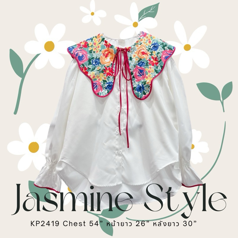 🌷🤍Jasmine Style🤍🌷 อก54“ เสื้อเชิ้ตแขนยาวแต่งกุ้นปกดอกไม้เก๋ๆ สม็อคแขนคิ้วท์ๆอกใหญ่ใส่สบายย-2419