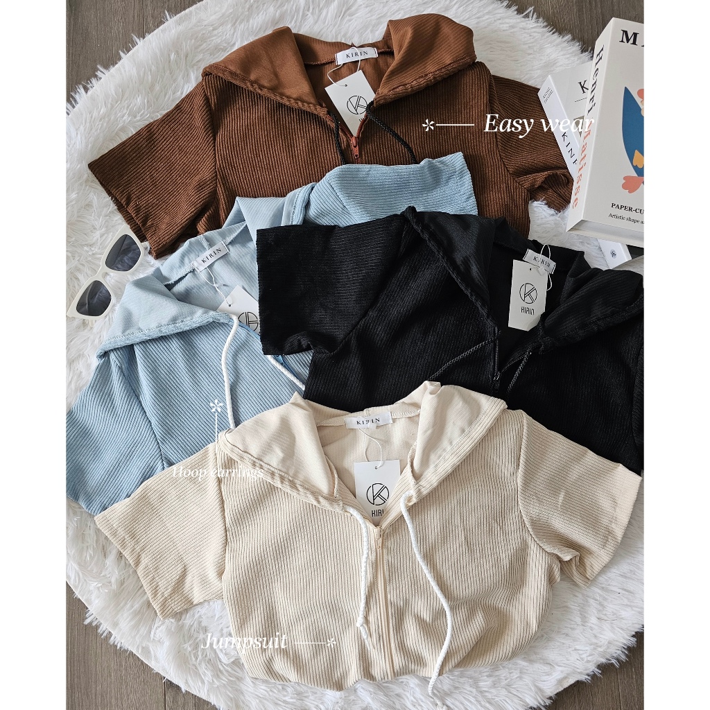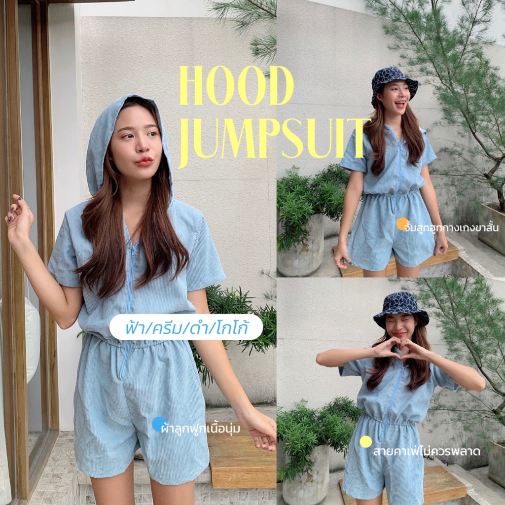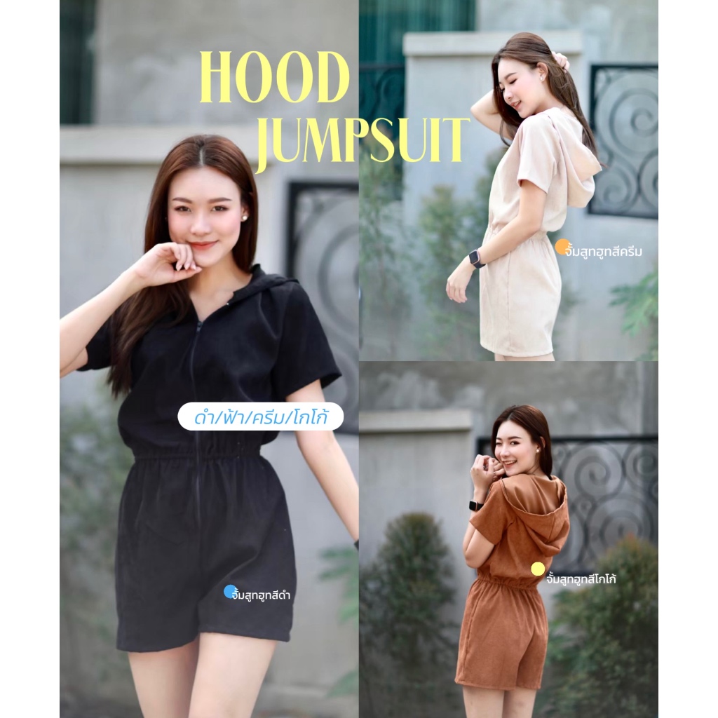 Hoody Jumpsuit จั้มสูทขาสั้น มีฮู้ด ซิปหน้ายาว ผ้าลูกฟูก ฮู้ดเชือกรูดได้ น่ารัก สินค้าพร้อมส่ง