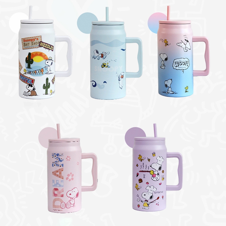 จัดส่งกรุงเทพฯ Snoopy แก้วเก็บความเย็น 1500ml พร้อมที่จับและฝาฟางถ้วยแก้วกระติกเก็บความร้อนและเย็นถ้วยน้ำในรถยนต์ข