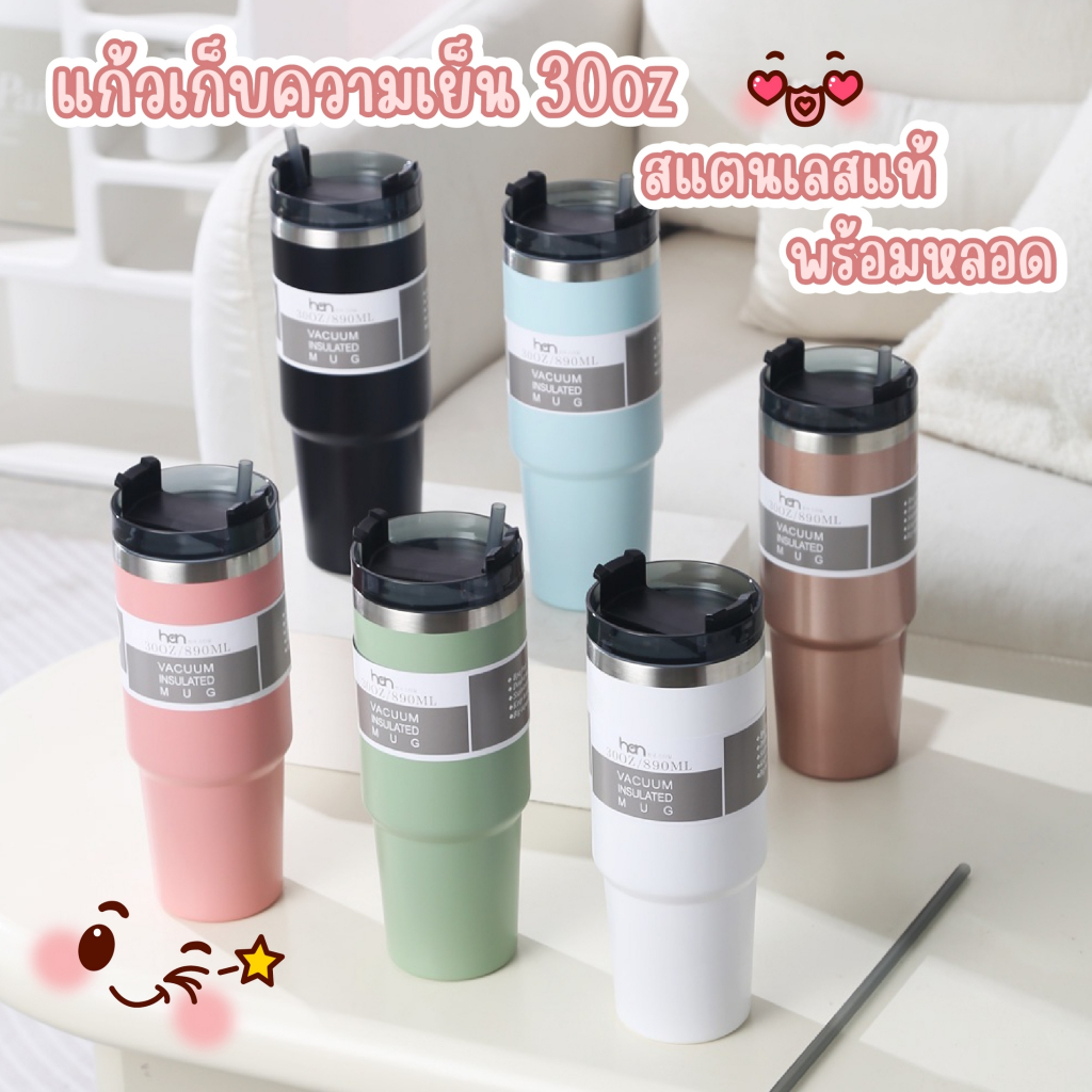 แก้วเก็บความเย็น แก้วนํ้าเก็บความเย็น ขวดน้ํา แก้วขอบเงินทรงสูง แก้วน้ำสแตนเลส 30oz 890ml. สีพื้น แถมฟรีหลอด สแตนเลส304