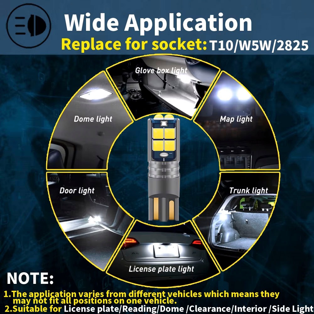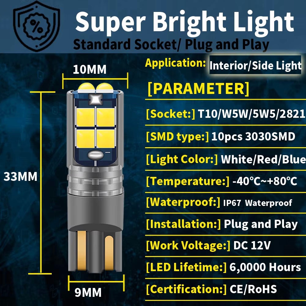 หลอดไฟ T10 LED มีประโยชน์ สําหรับป้ายทะเบียนรถยนต์ หลอดไฟหรี่ ขั้ว T10 W5W LED 10 ชิพ เหมาะสำหรับรถมอเตอร์ไซค์