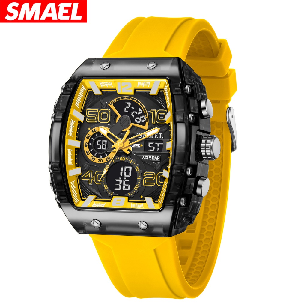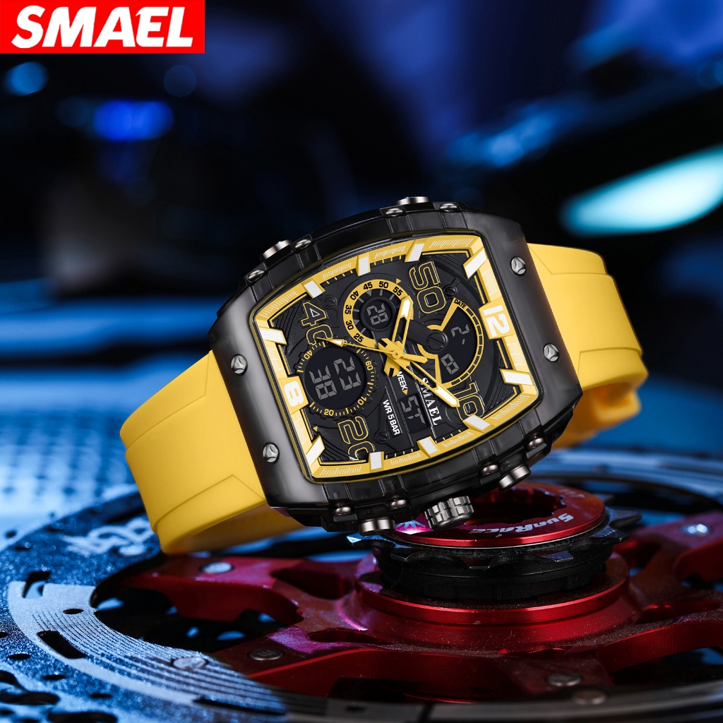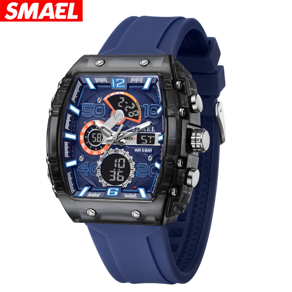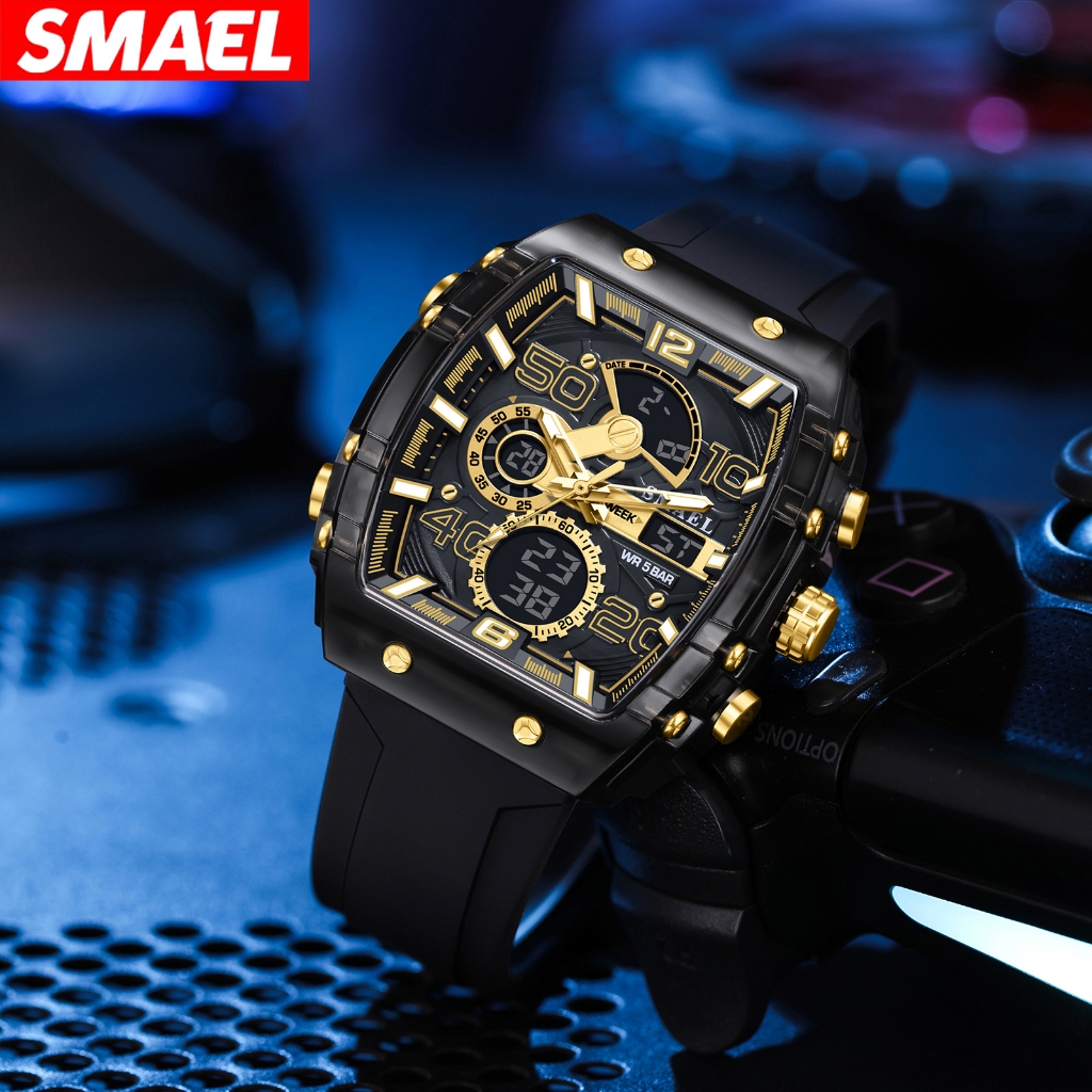 Smael Creative Barrel-Shaped Dial กระจกโค้งนาฬิกาผู้ชายแฟชั่น Dual Display นาฬิกาข้อมือควอตซ์ยี่ห้อกีฬากันน้ําวันที่นาฬิกา