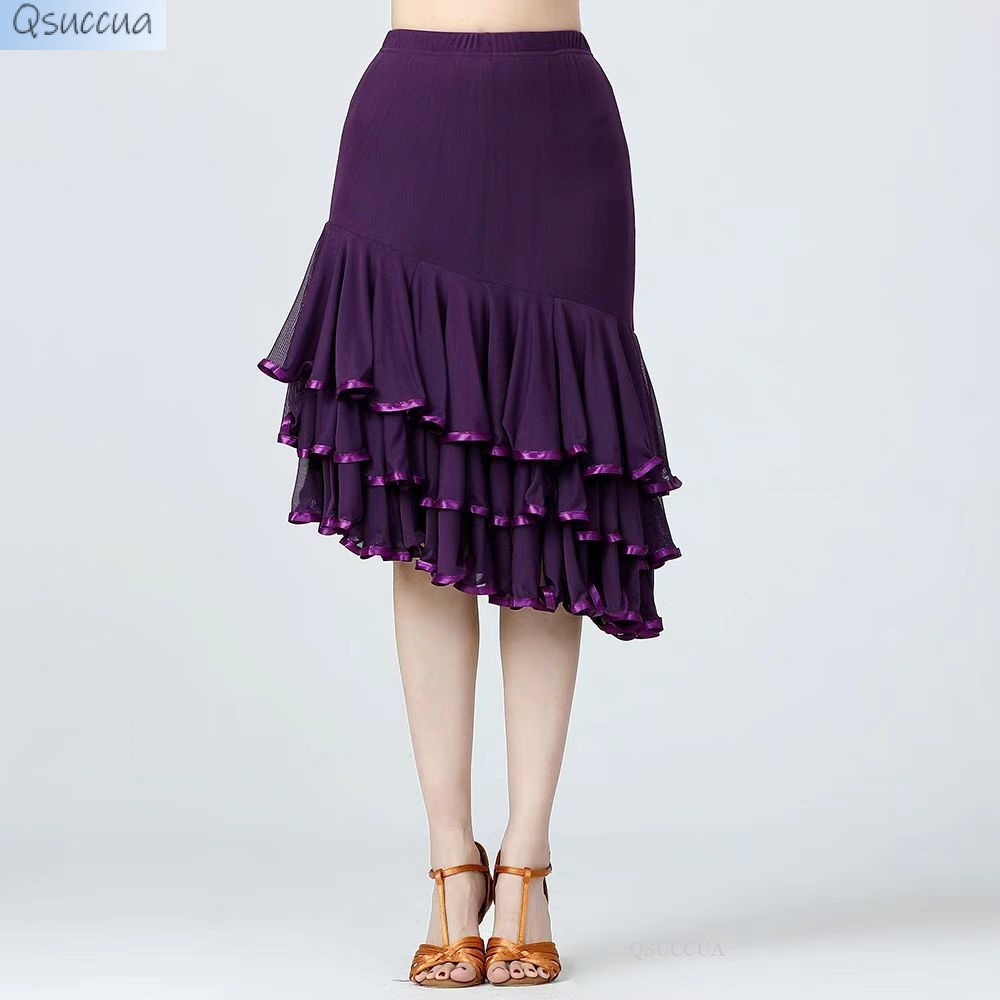 Qsuccua ผู้ใหญ่สุภาพสตรี Latin Ballroom Dance ไม่สม่ําเสมอ Hem กระโปรงตาข่ายหลายชั้น