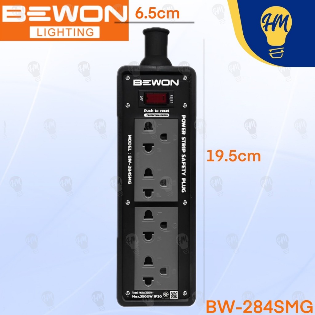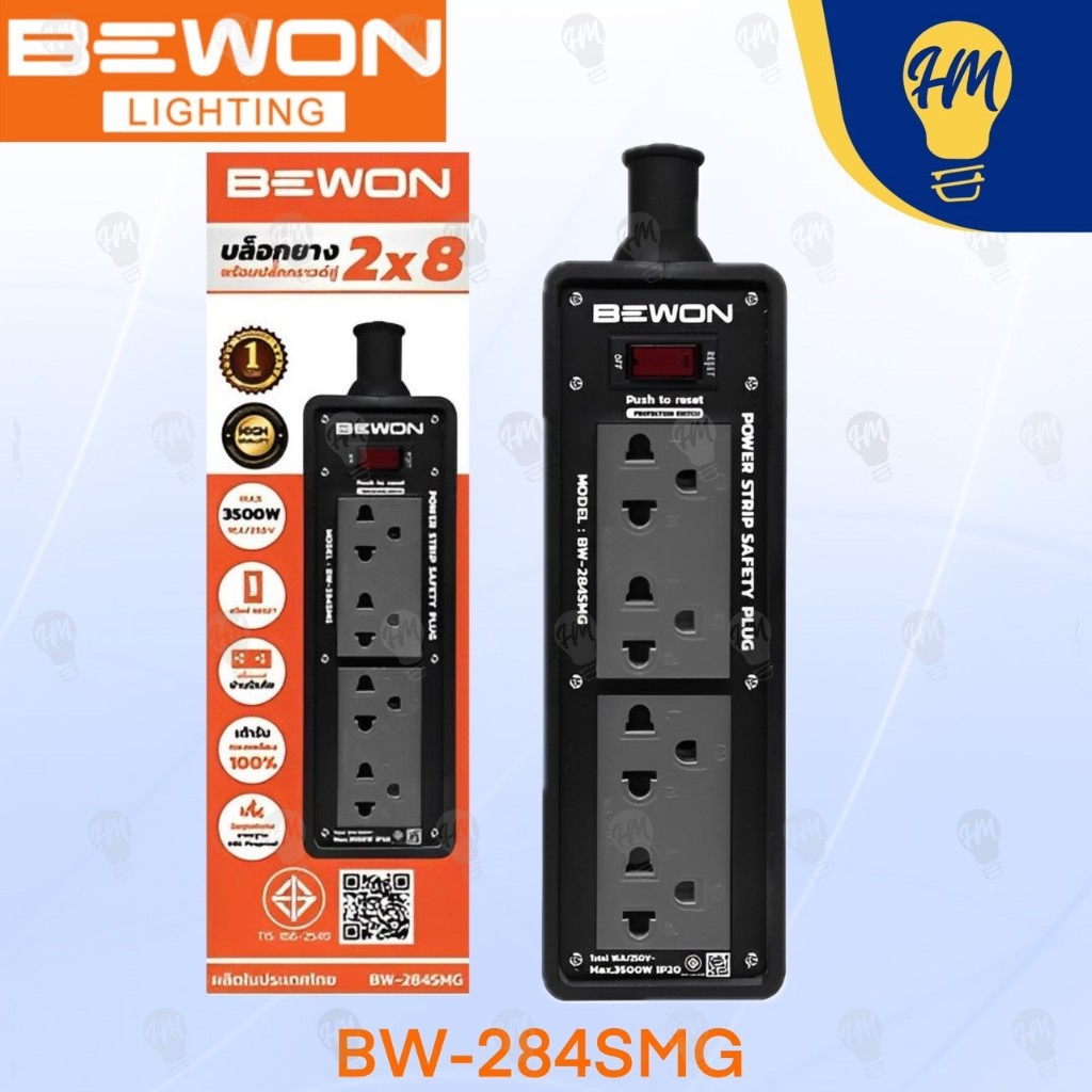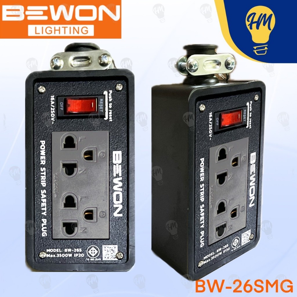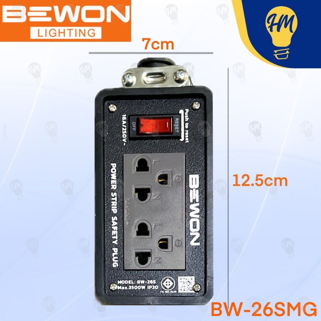 Bewon ปลั๊กไฟ บล็อคยาง สีเทา พร้อมปล๊กกราวด์คู่+สวิตซ์รีเซ็ต 2X6 , 2x8