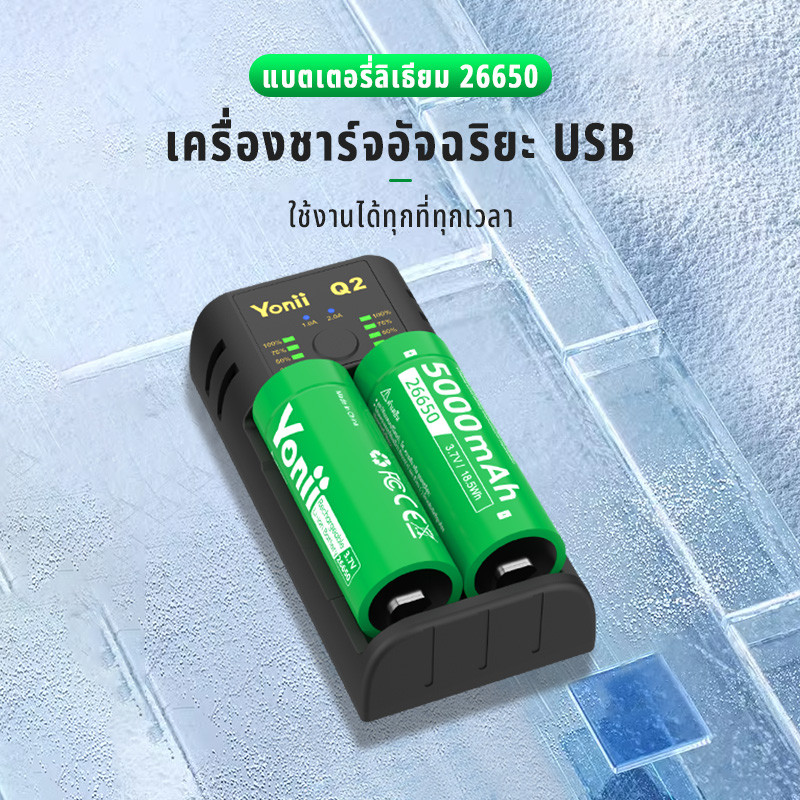 Yonii 26650 แบตเตอรี่ลิเธียม 5000mAh 3.7V 20A ถ่านชาร์จ 26650 เขียว ความสูง 70mm หัวนูน Li-ion Battery