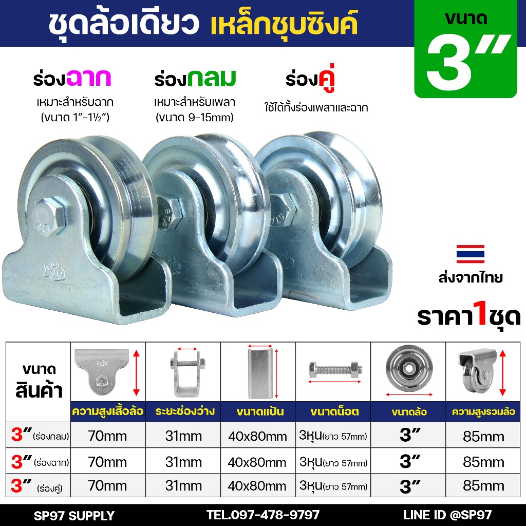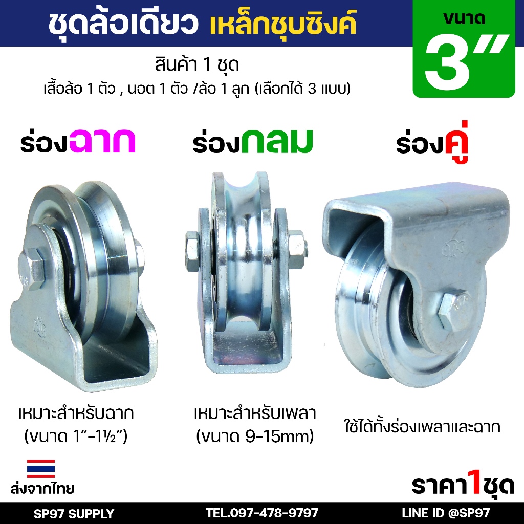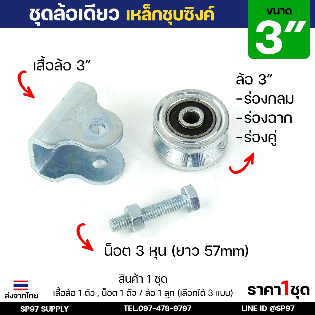 ชุด ล้อเดี่ยว 3 นิ้ว พร้อมล้อ (ตราปลา) เหล็กเหนียว ชุบซิงค์ ร่องกลม / ร่องฉาก สำหรับ ประตูรั้ว ประตูบานเลื่อน (1ชุด)