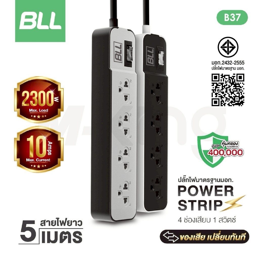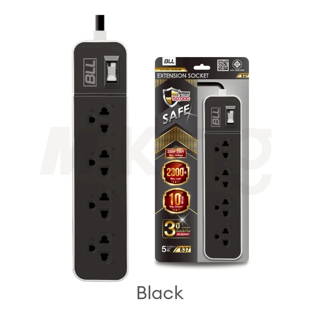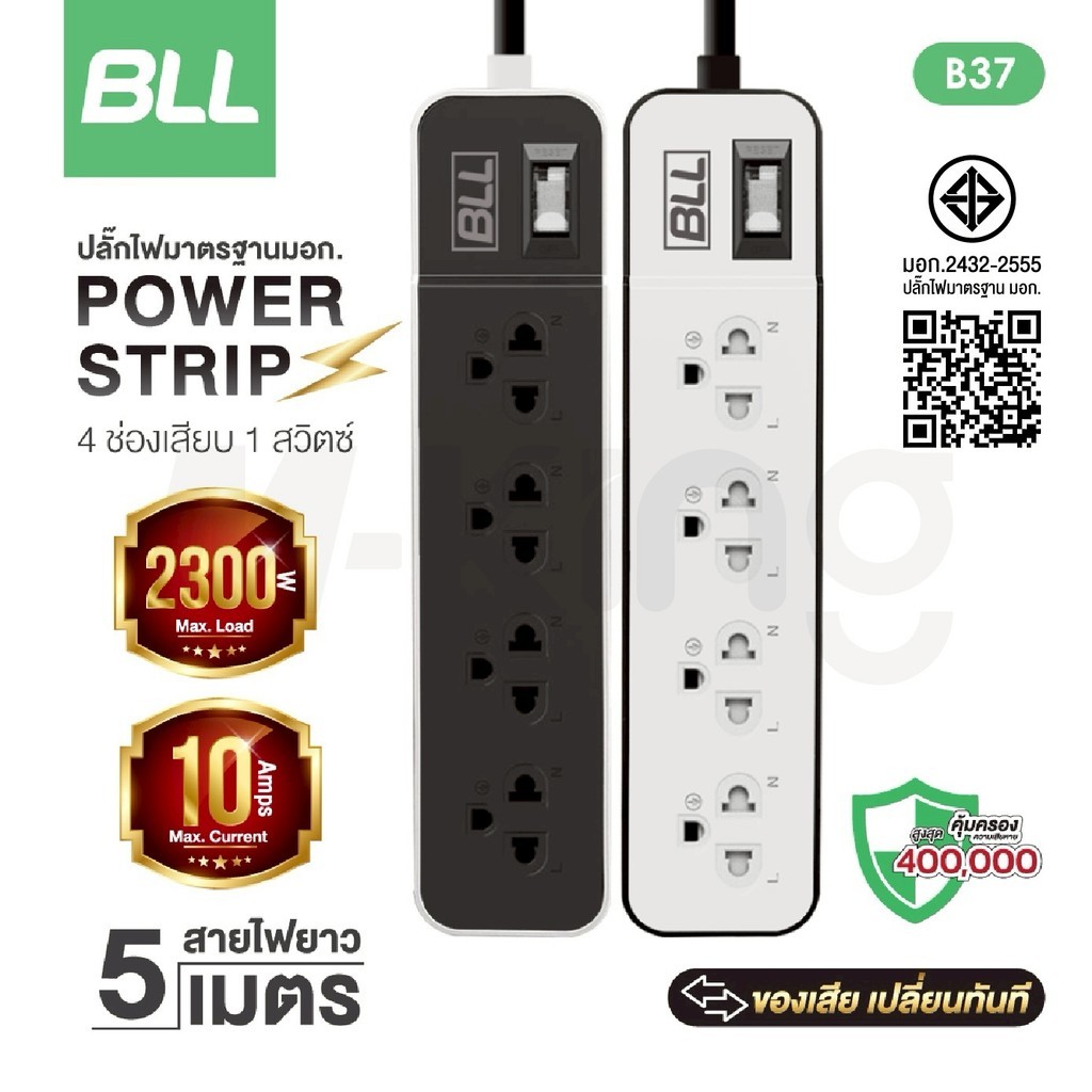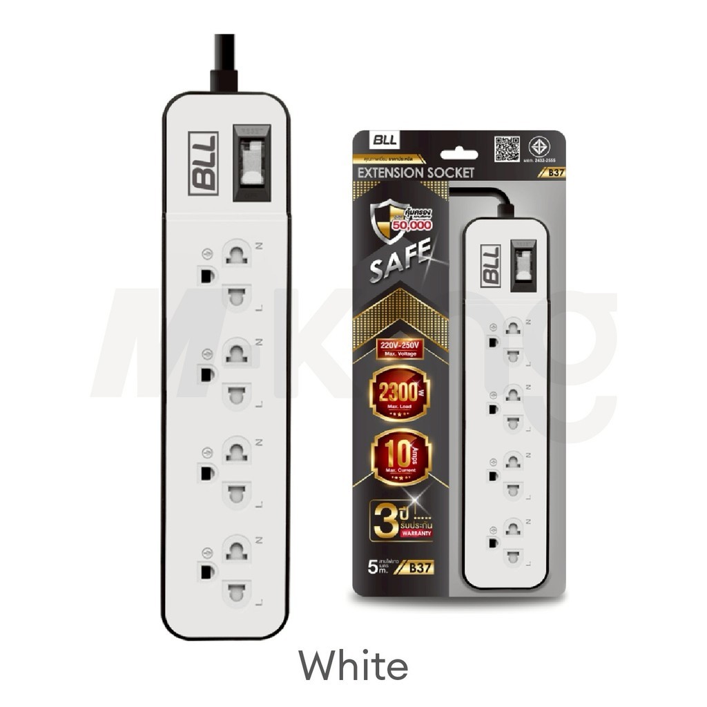 BLL ปลั๊กไฟพ่วง รางปลั๊ก 4ช่องเสียบ 1สวิตซ์ สายยาว 5เมตร มีมอก รุ่นB37 กำลังไฟสูงสุด 2,300 วัตต์