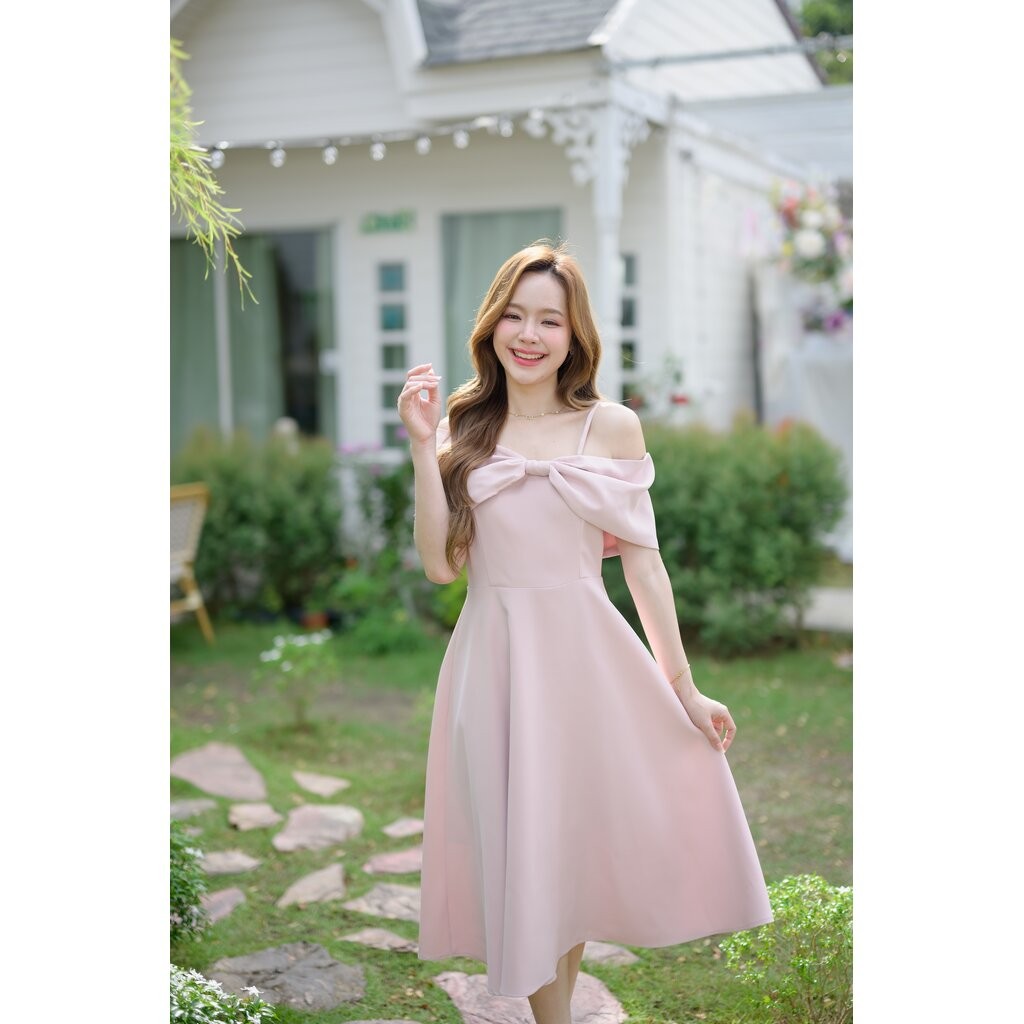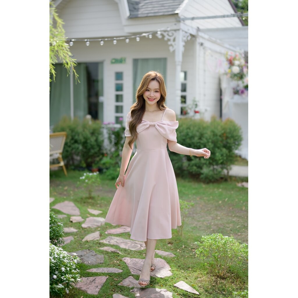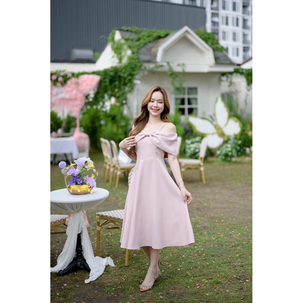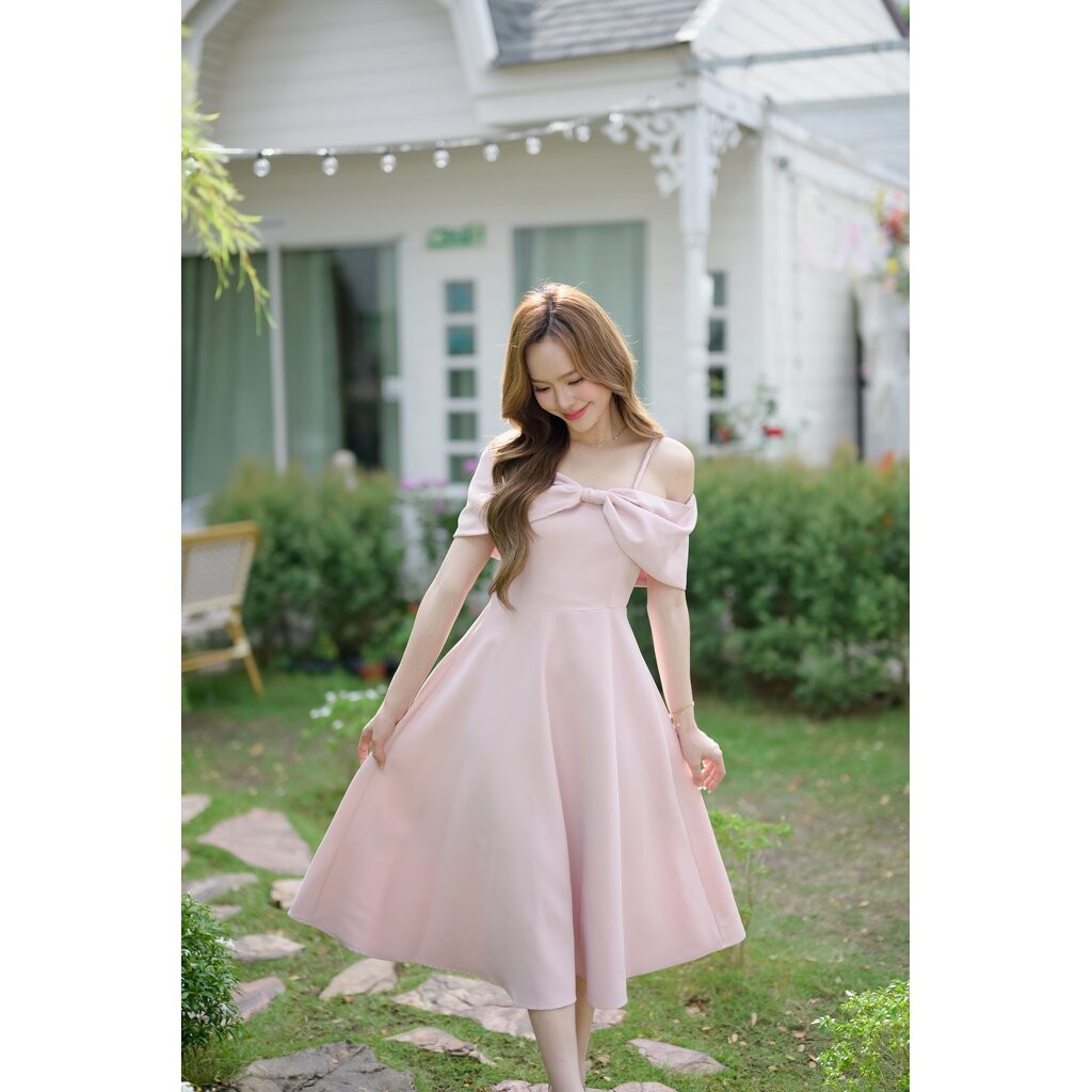 Charming Off-Shoulder Midi Dress : สีชมพู [Made by Pastel Time]