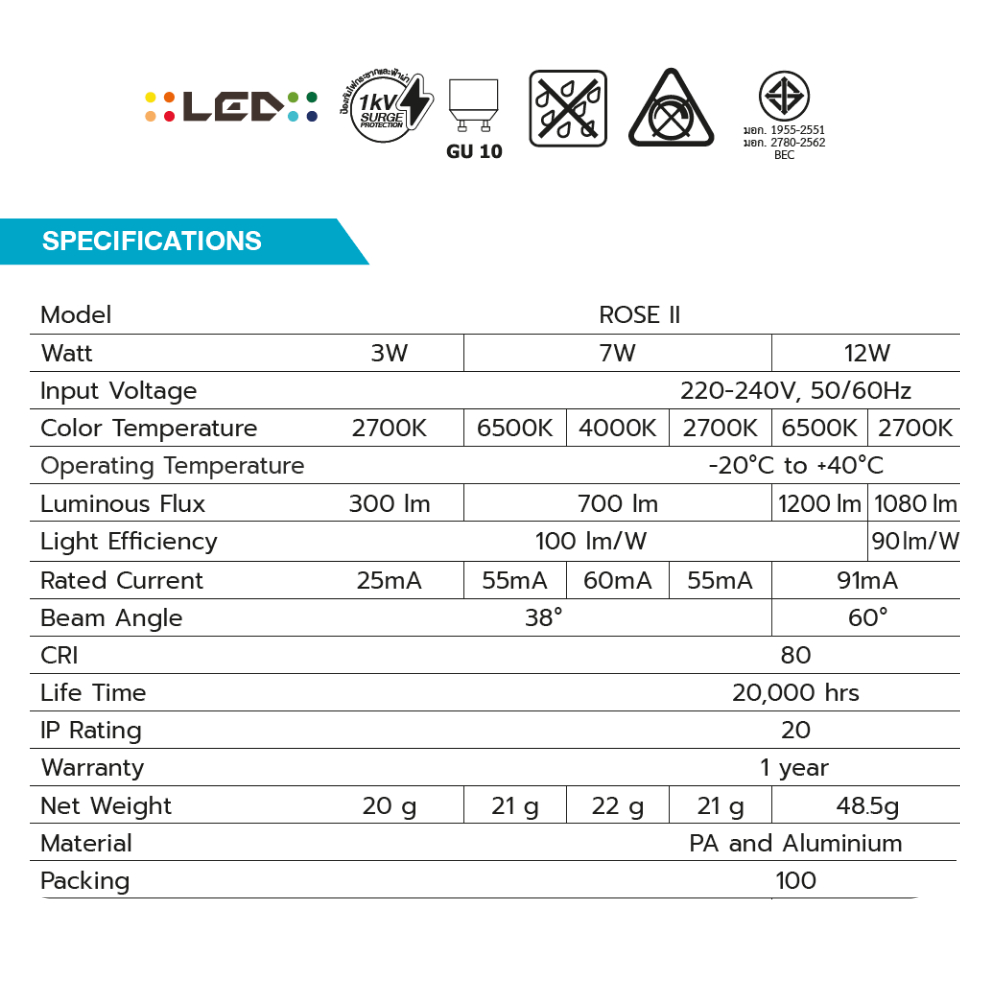 BEC Rose II หลอดไฟ Led MR16 GU10 3W 7W 220V 2700K/6500K รวมแวท ออกใบกำกับภาษีได้