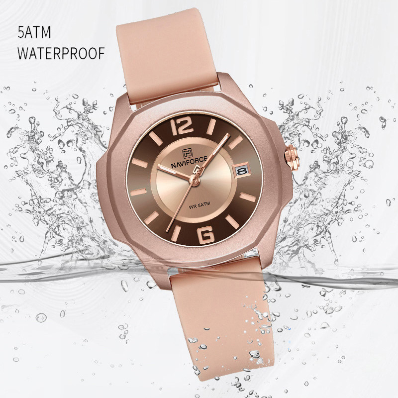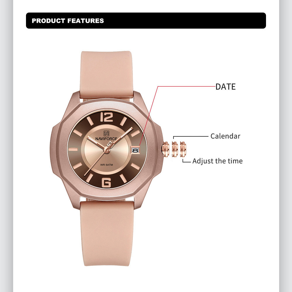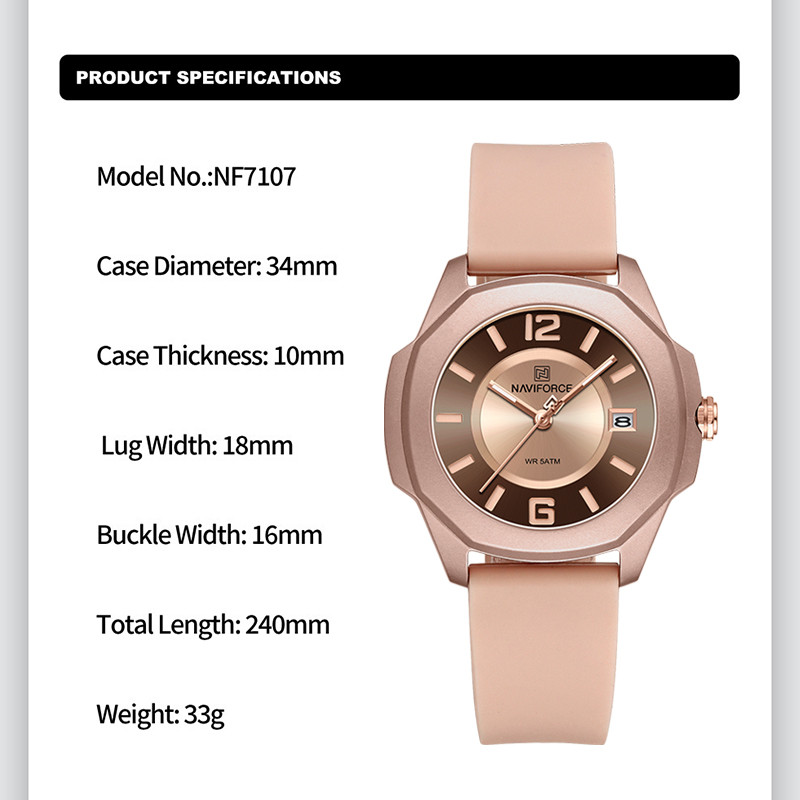 Naviforce NF7107 เทรนด์แบรนด์หญิง Casual Quartz ปฏิทิน Fumed Silica Band 50m กันน้ํานาฬิกาสุภาพสตรี