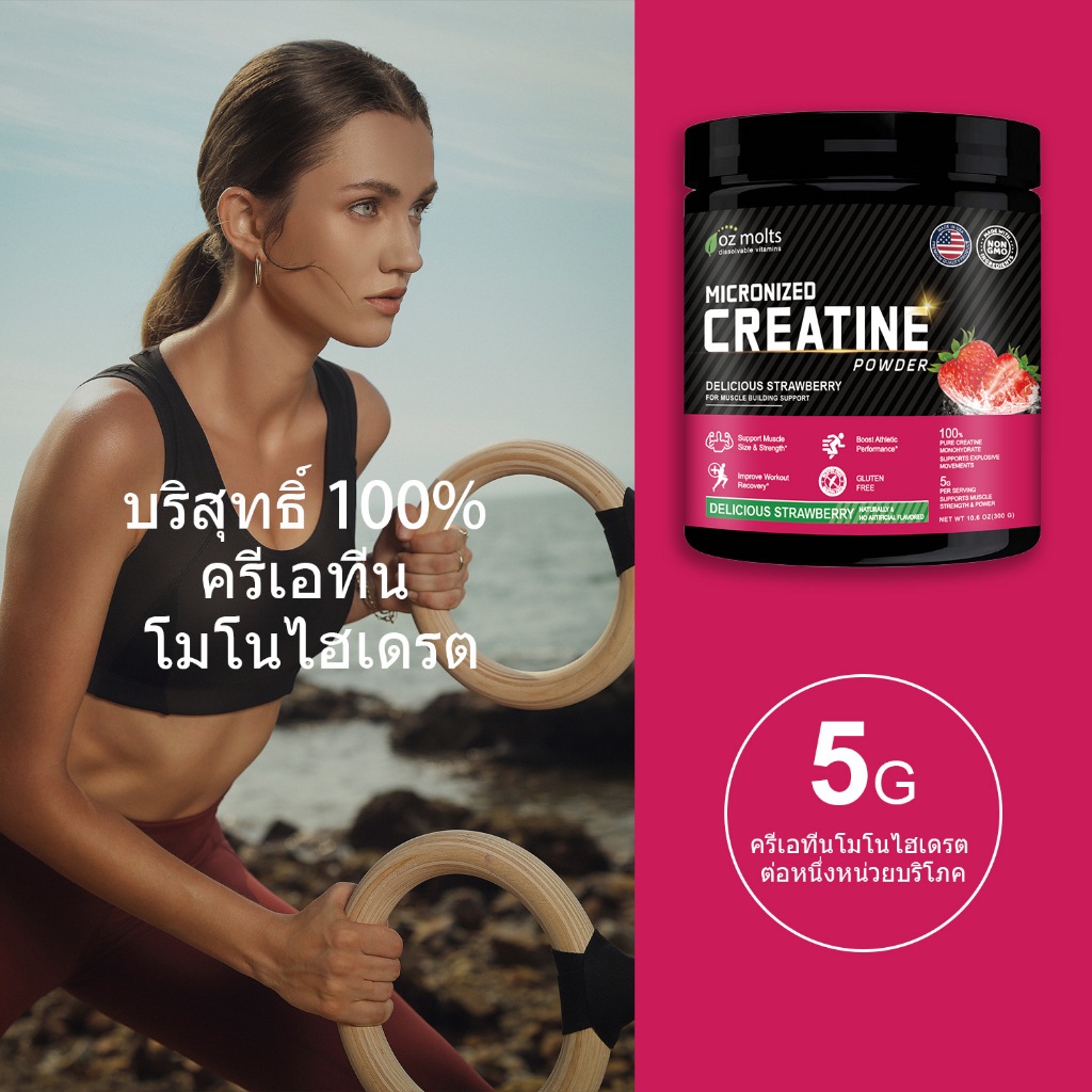 Ozmolts Creatine Powder ครีเอทีน เติมพลังงาน Energy Support การออกกำลังกายกีฬา Strawberry 300g