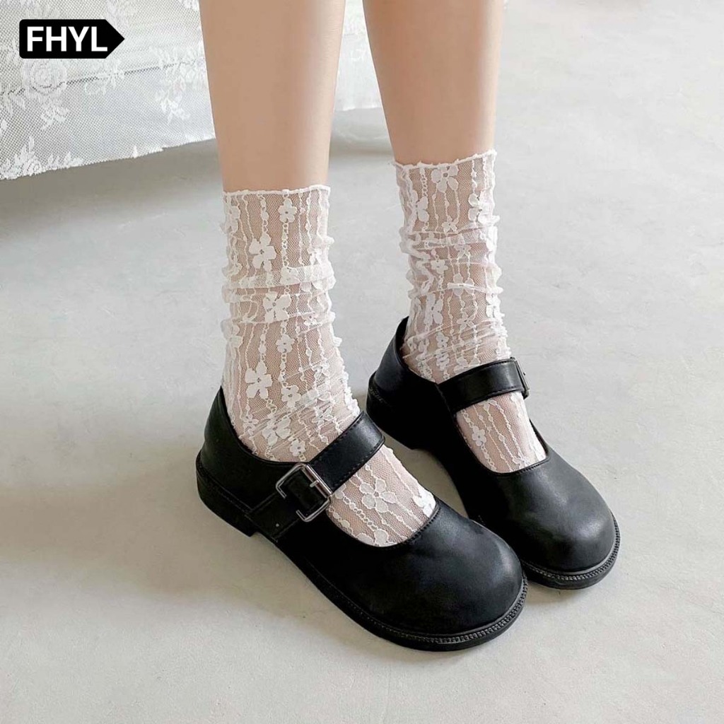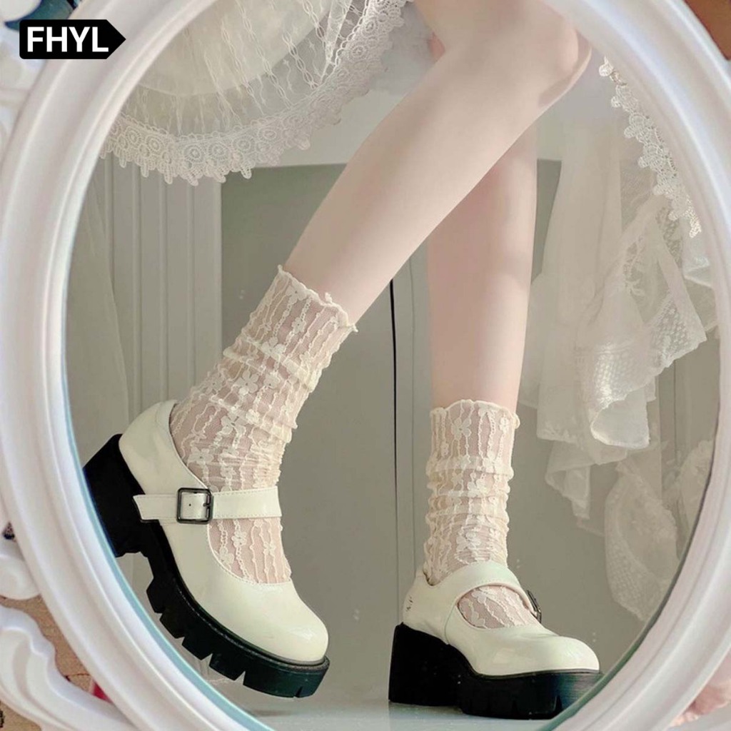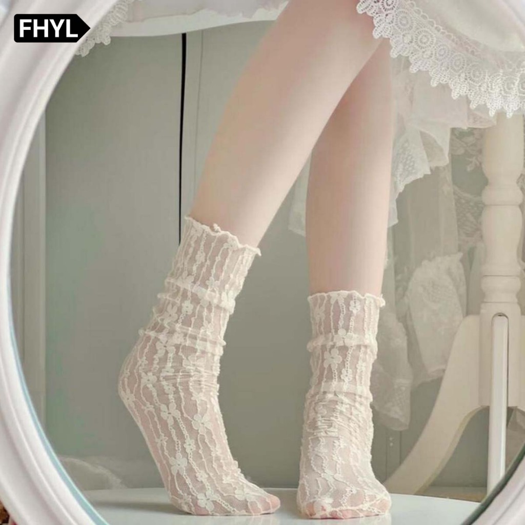 FHYL ถุงเท้าข้อกลาง ผ้าตาข่าย แต่งลูกไม้ ลายดอกไม้ สีขาว สไตล์ญี่ปุ่น แฟชั่นฤดูร้อน สําหรับผู้หญิง