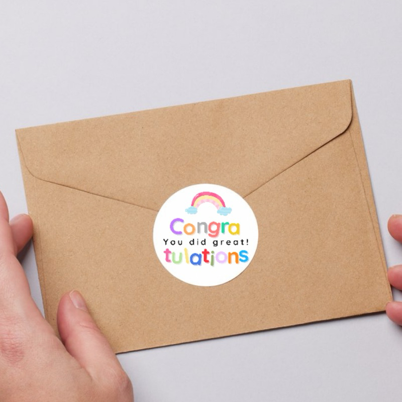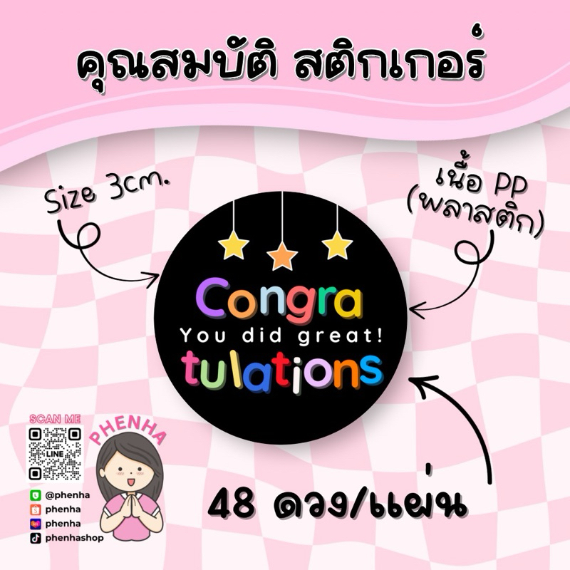 สติ๊กเกอร์แสดงความยินดี Congratulations เนื้อพลาสติก PP กันน้ำ 48ดวง/แผ่น