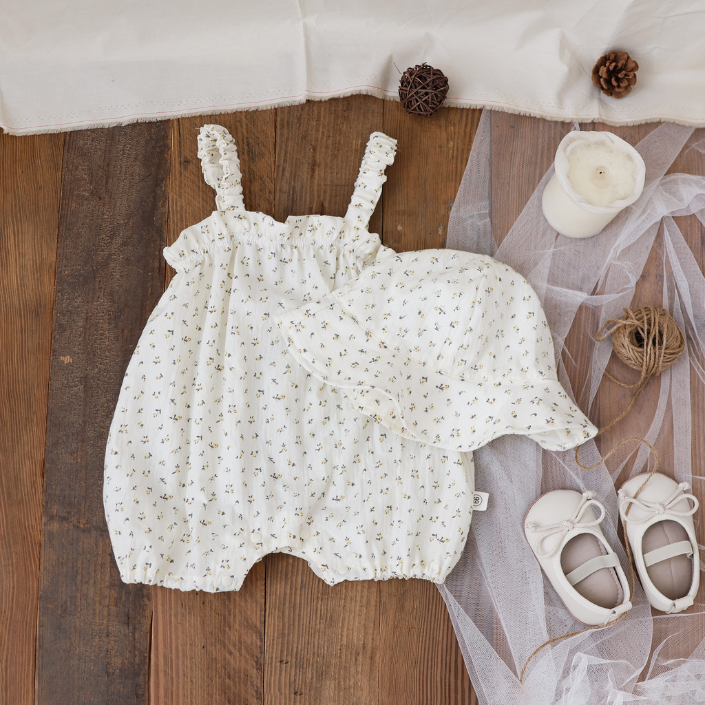 ฤดูร้อนผ้าฝ้ายแขนสั้น ชุดรอมเปอร์ กับหมวกเด็กทารกสาวเสื้อผ้า 0-24 เดือน