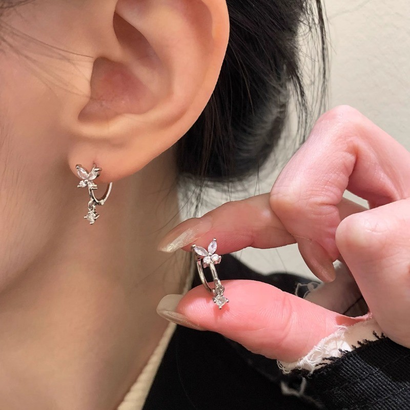 เราดอกไม้เกาหลี s925 เงิน Shining คริสตัลผีเสื้อ Hoop ต่างหูแฟชั่นผู้หญิง Pierced หูเครื่องประดับ