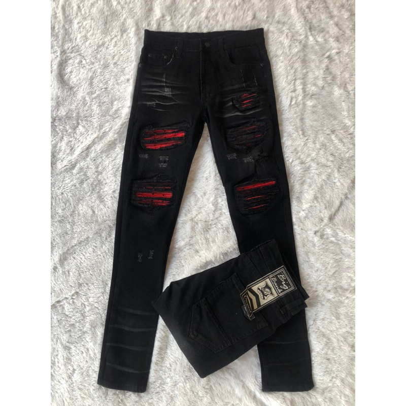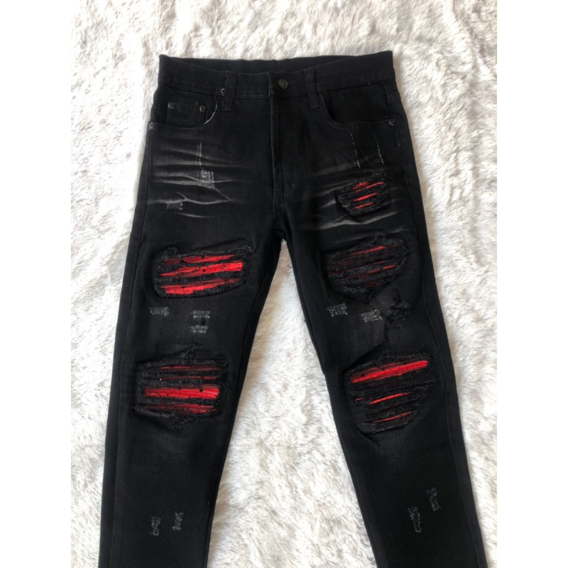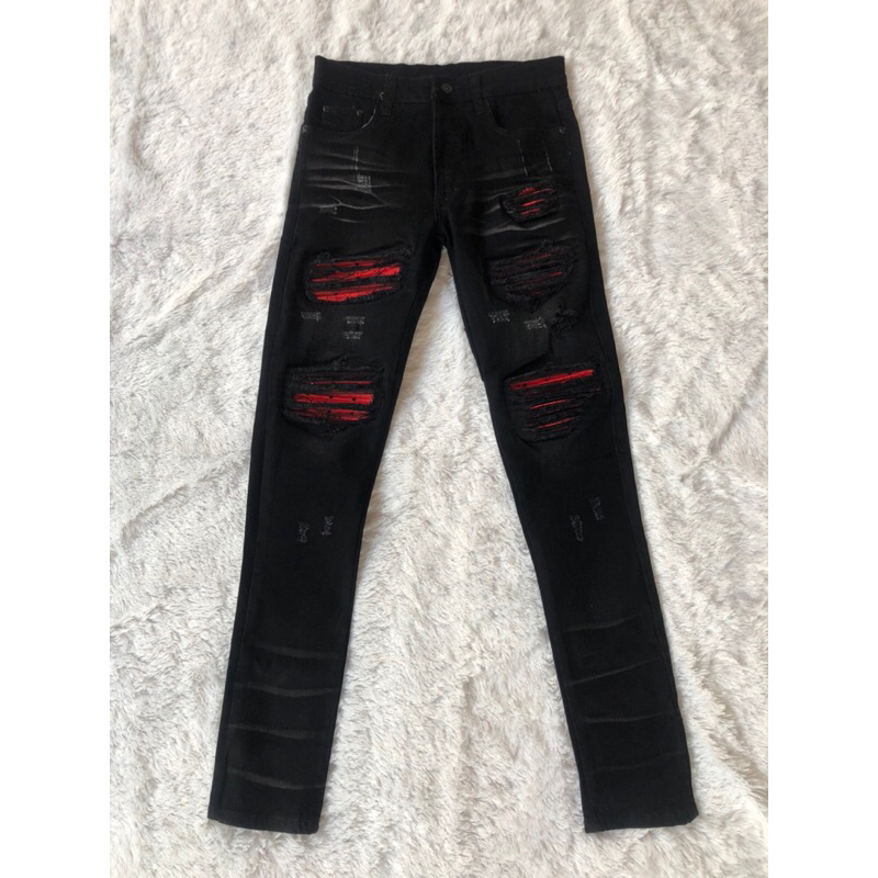 กางเกงยีนส์สีดำฟอกขาเดฟผ้ายืด ปะหนังแดงขาดปะ 5 จุด