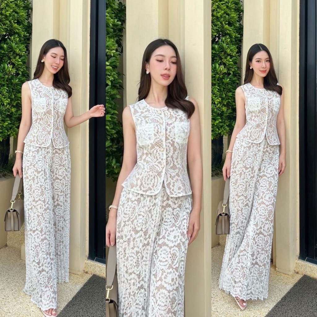 S-XXL ชุดเซทกางเกงขาวยาว เสื้อลูกไม้ สีขาว/ชมพู/ดำ ใส่ทำบุญ ไปงานแต่งงานบวช