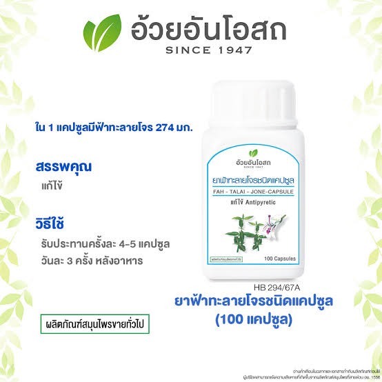 ฟ้าทะลายโจร อภัยภูเบศร อ้วยอัน ใบห่อ แคปซูล ฟ้าทะลายโจรชนิดแคปซูล