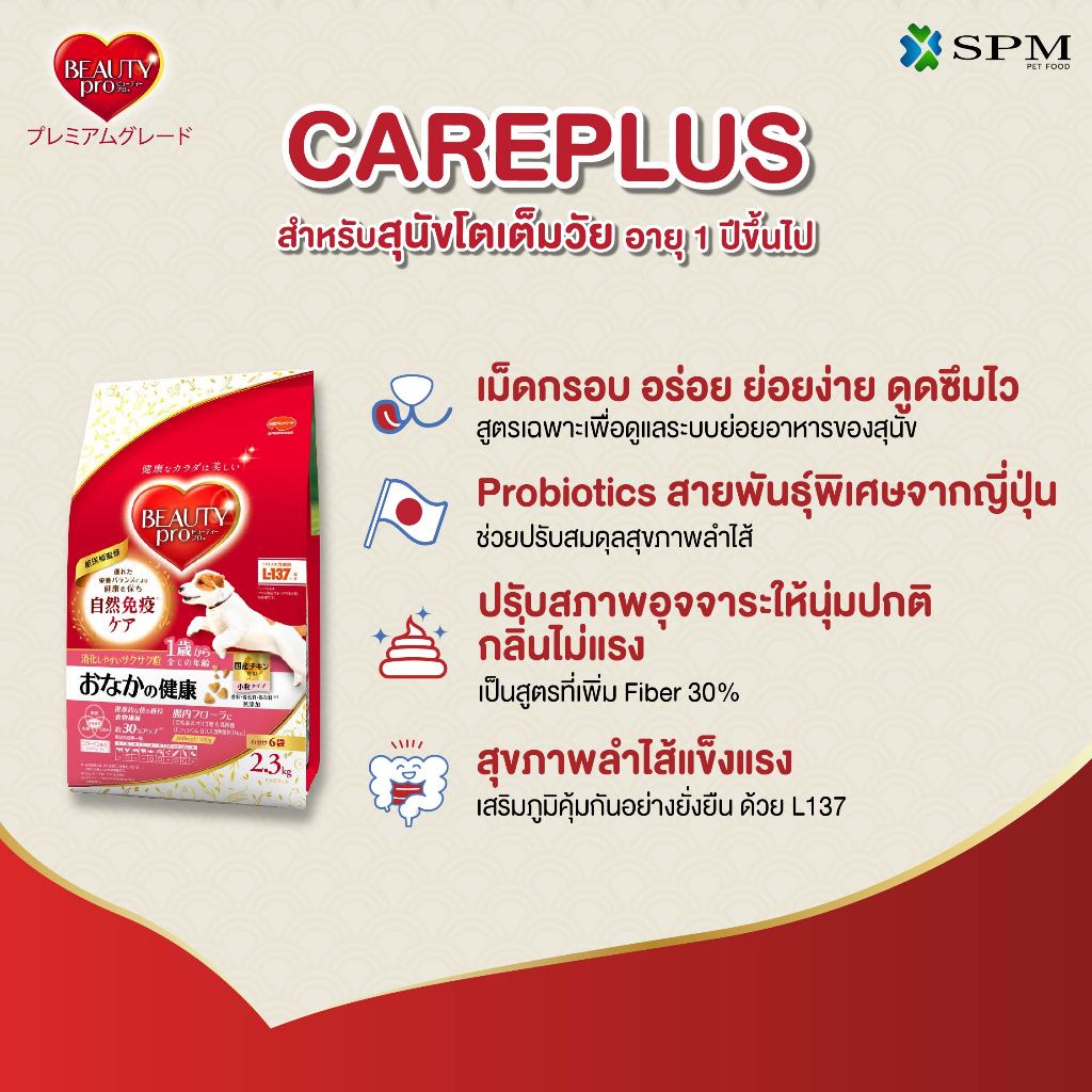 BeautyPro อาหารเม็ดสุนัขพรีเมียม สูตรCare Plus แคร์พลัสสำหรับอายุ 1 ปี+ ขนาด 2.3Kg. ปรับสมดุลลำไส้