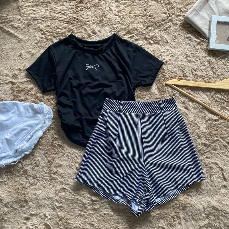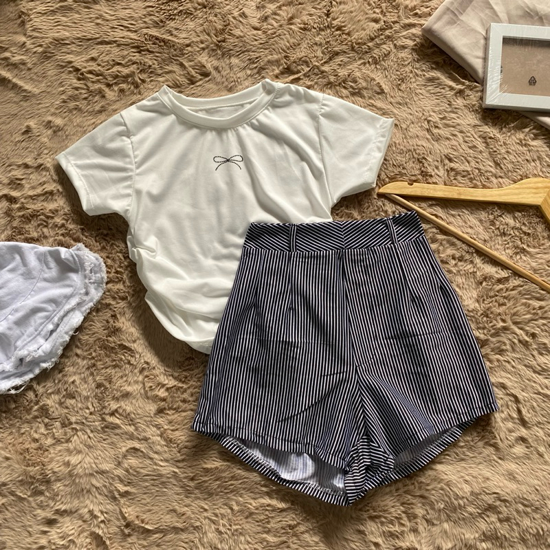 ชุดเซต2ชิ้น เสื้อหยุมข้างลายโบว์ กางเกงลายริ้ว เซ็ตโบว์กางเกงสม็อคหลัง