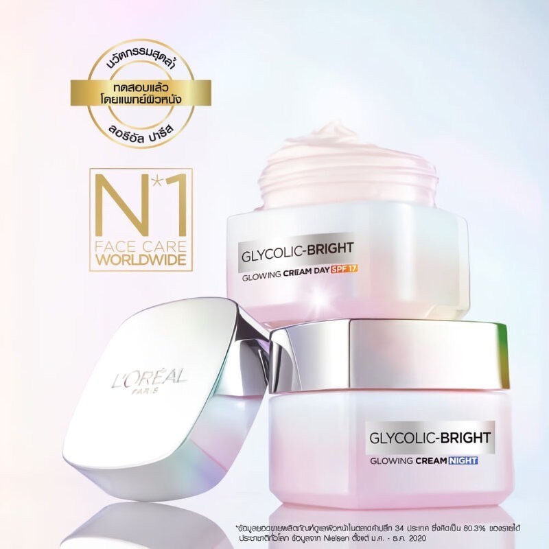 ครีมบำรุงผิวหน้า L'Oreal ลอรีอัล ปารีส ไกลโคลิค-ไบรท์ โกลว์อิ้ง SPF 17 เดย์ครีม&ไนท์ครีม ขนาด 15 มล.
